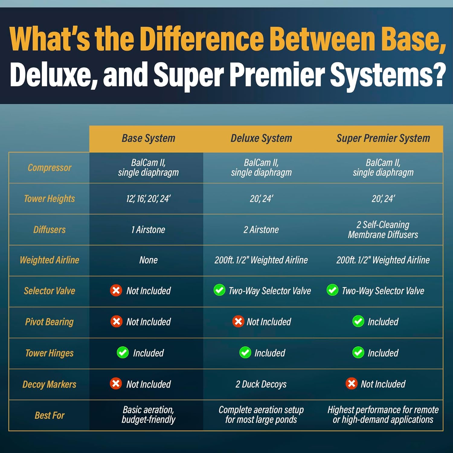 - Can aerate ponds up to 2-3 acres, operates with low winds, adds oxygen and prevents pond stratification preventing fish kills