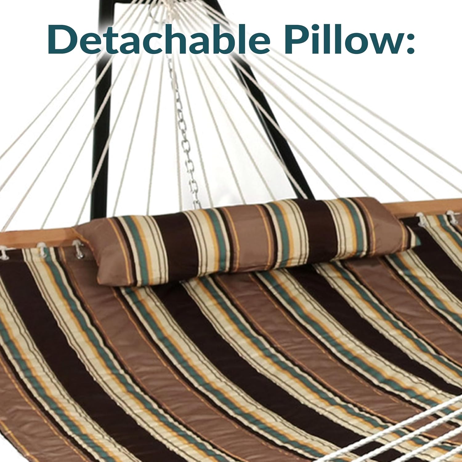 - VERSATILE HANGING OPTIONS: The quilted hammock features attached chains for easy hanging. This two person hammock swing can be tied between trees, poles, or used with a 12' to 15' hammock stand (not included). It's wonderful for a variety of indoor or outdoor locations including the backyard, campsite, patio, sunroom, or bedroom.