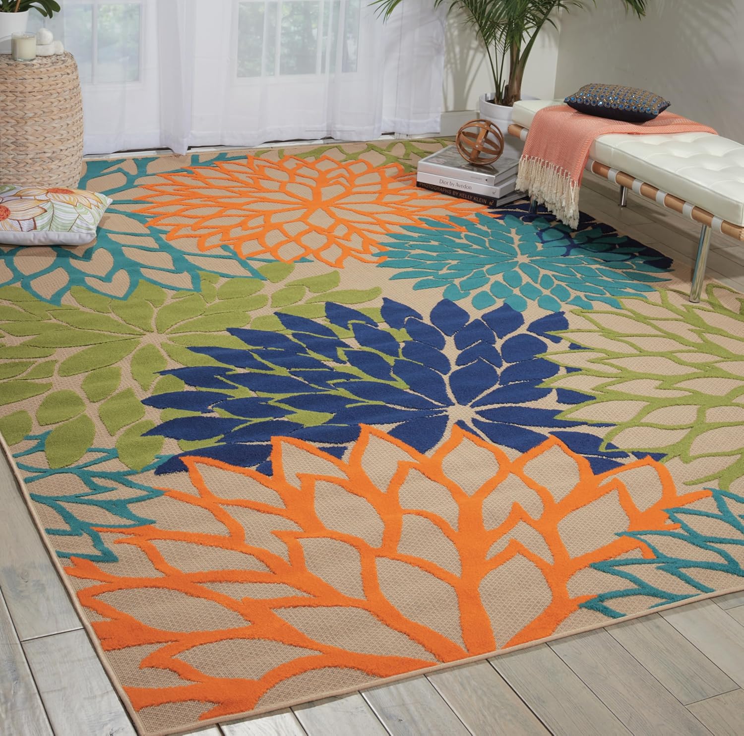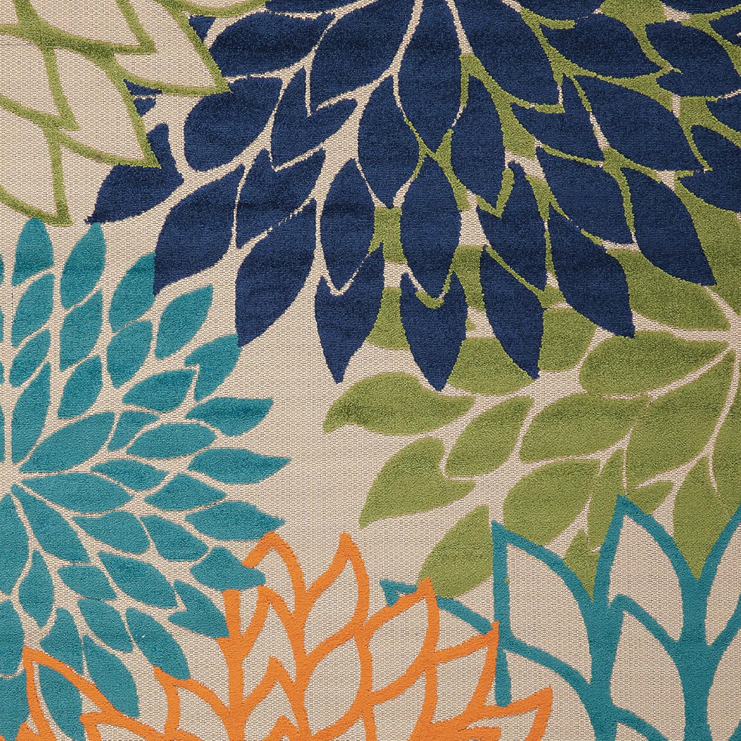 - This indoor and outdoor rug has solid and outlined lotus patterns in navy, blue, orange, and green