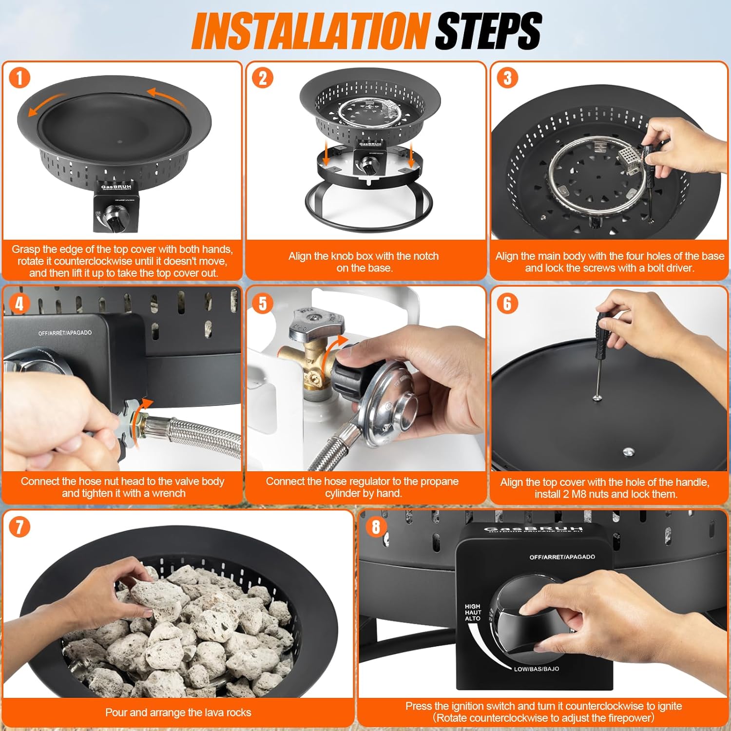 - .ALL-IN-ONE Fire Pit Propane: Our outdoor gas fire pit comes with a cover and carry handle, a pre-attached 10-foot braid stainless hose to keep your standard 20-lb propane tank (not included) safely tucked away, a fully adjustable regulator with a chrome knob for controlling flame size, and a 4.8-lb natural lava rock set to enhance the flickering flame effect.
