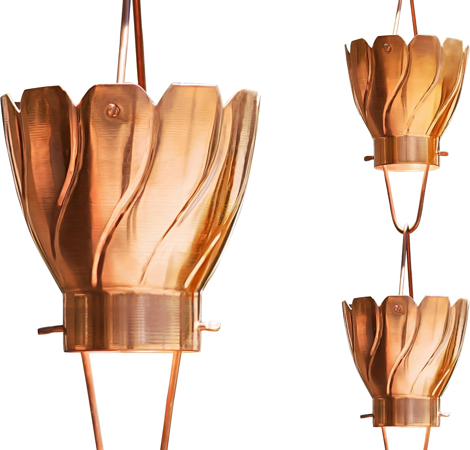 - DISTINCTIVE AKIRA DESIGN IN COPPER: Featuring a unique scalloped rim design, each cup of this copper rain chain for gutters adds visual interest while guiding rainwater smoothly. Over time, the copper rain chains for gutters develop a rich, rustic patina.