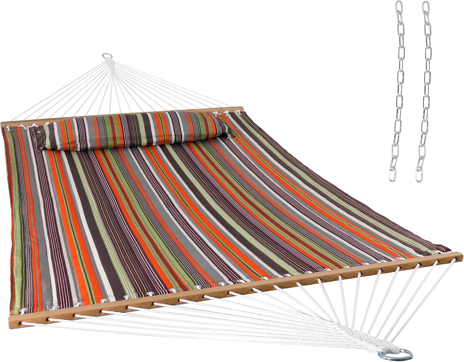 - VERSATILE HANGING OPTIONS: The quilted hammock features attached chains for easy hanging. This two person hammock swing can be tied between trees, poles, or used with a 12' to 15' hammock stand (not included). It's wonderful for a variety of indoor or outdoor locations including the backyard, campsite, patio, sunroom, or bedroom.