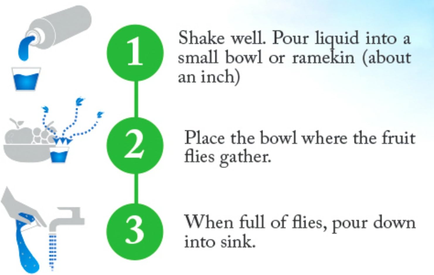 - EASY TO USE - Simply pour the fruit fly trap solution into a small dish or ramekin, place bowl where fruit flies gather - when it's full of fruit flies pour it down the drain. Simple yet incredibly effective.