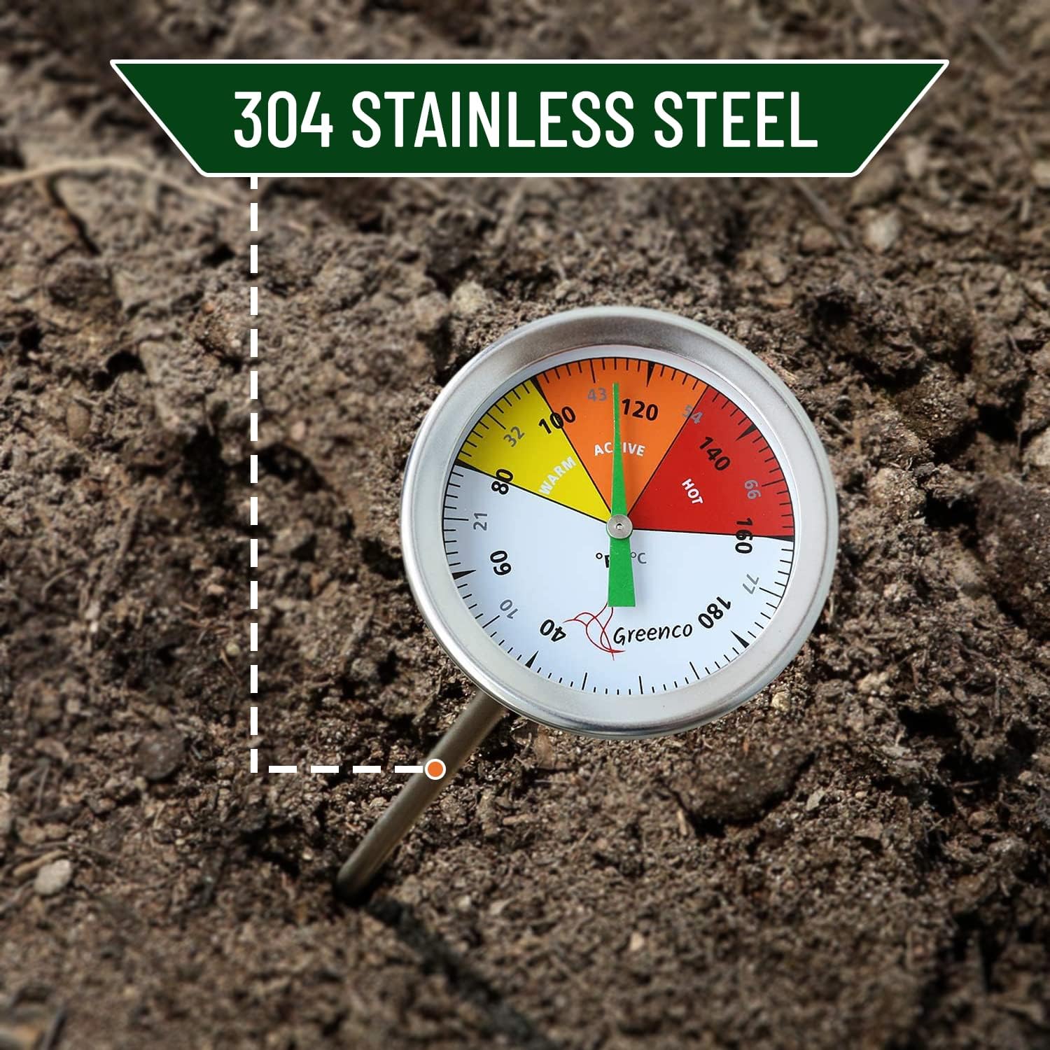 Compost Soil Thermometer by Greenco, Stainless Steel, Celsius and Fahrenheit Temperature Dial, 20 inch Stem