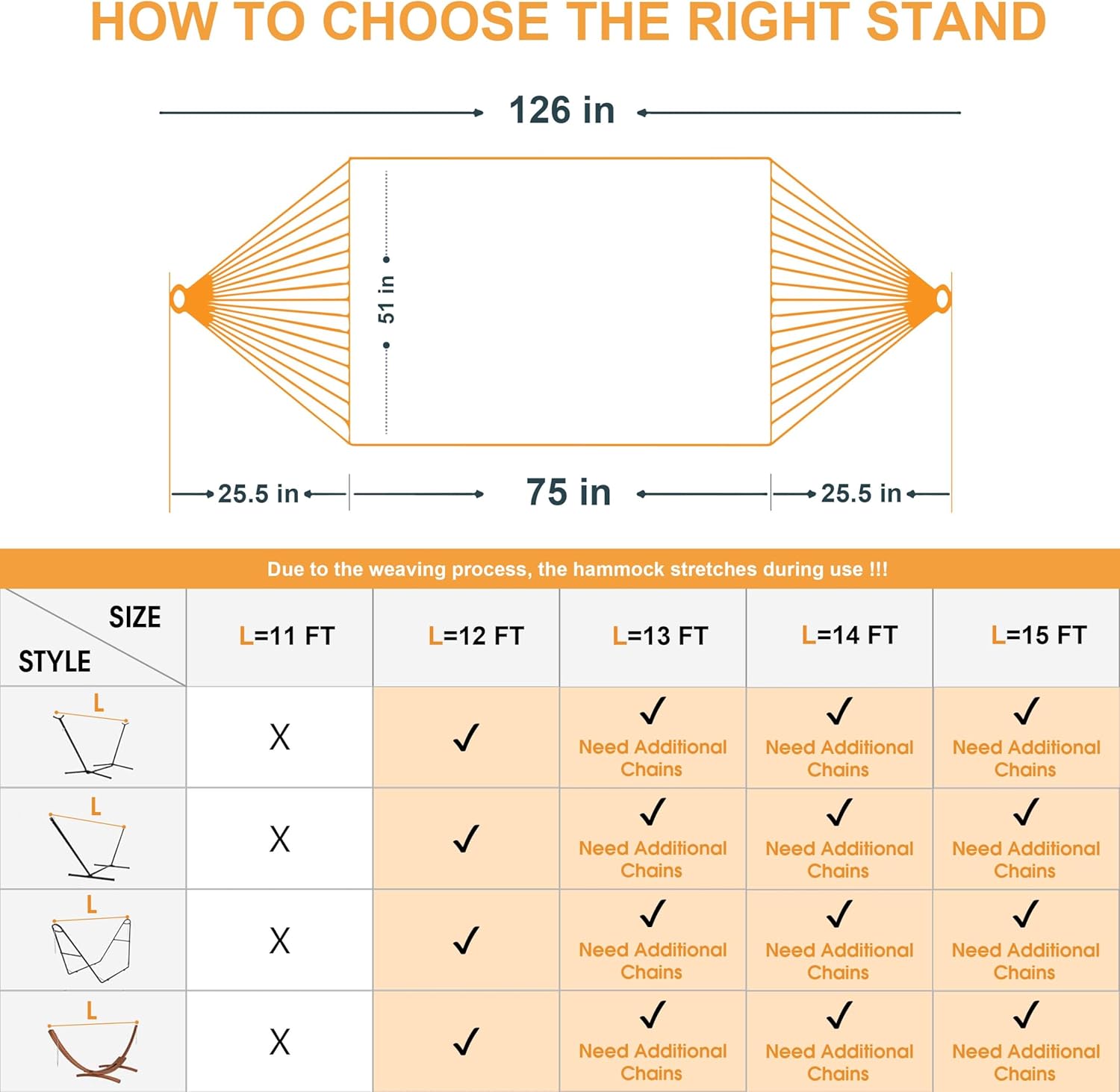 - Adapts to 12-13FT hammock stand: The hammock has an overall length of 126 inches and comes with two chains (each link is 7.4 inches long);Due to the way the hammock is woven, it stretches when in use,so 12-13FT hammock stand is required
