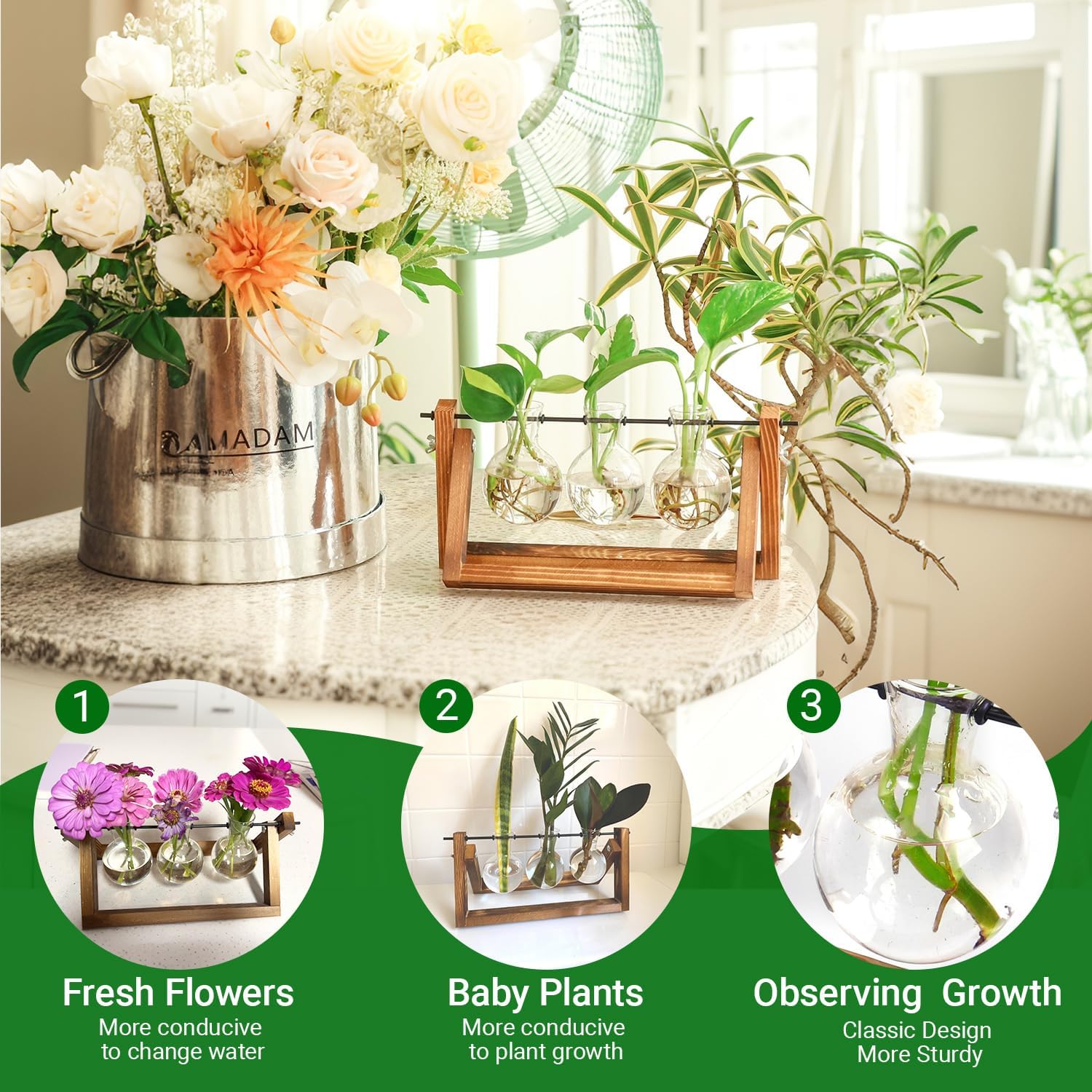 - Natural Wood Stand and Transparent Glass Vase: This propagating vases includes 3 bulb-shaped vases made of high borosilicate heat-resistant glass. The frame is crafted from sturdy and durable natural wood.The longer the time, the more delicate the wood looks