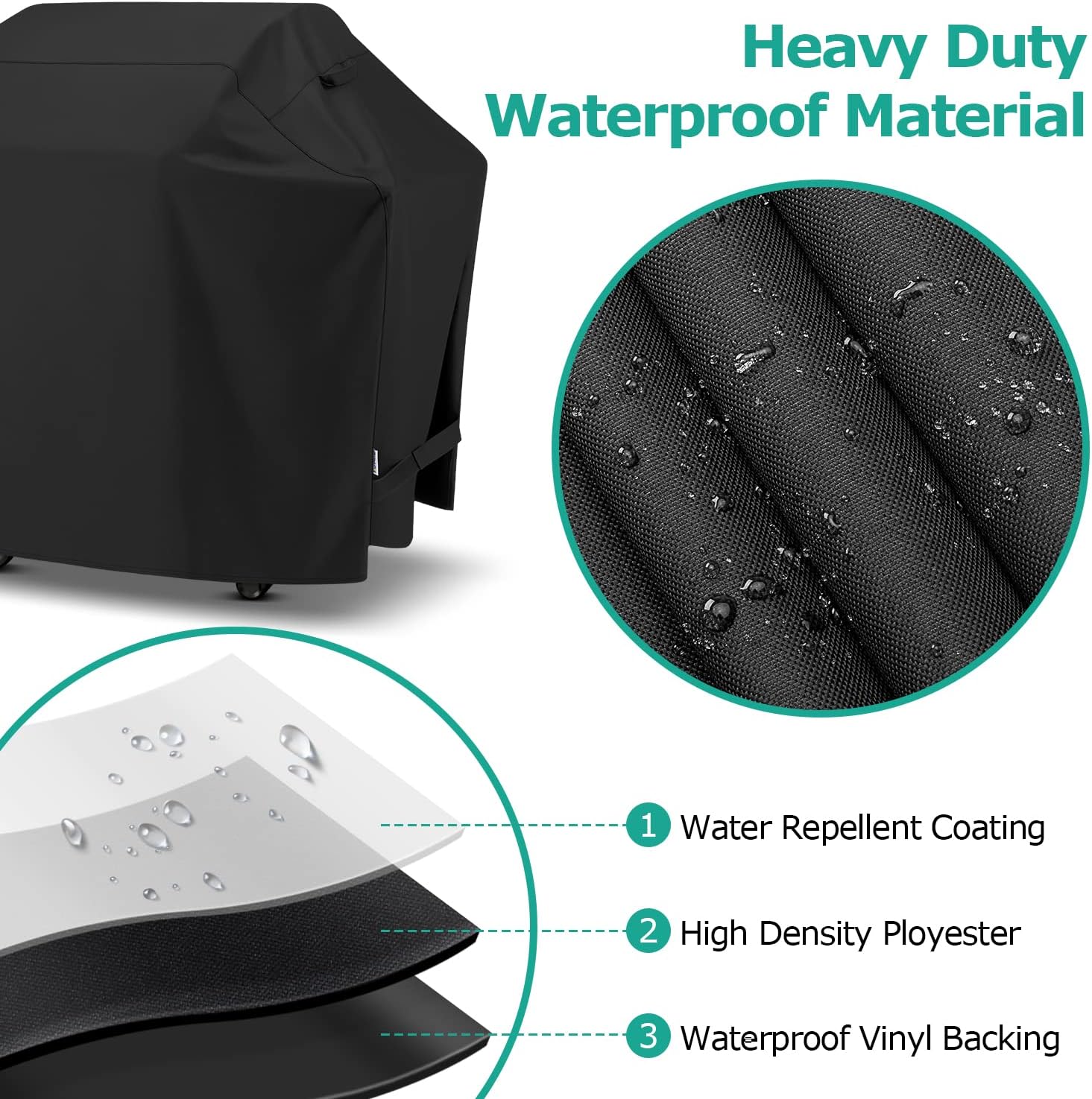 - FadeStop and Waterproof - Made of high performance UV resistant and FadeStop Polyester fabric with waterproof vinyl lining, resists to fading, tearing and cold cracking, so your grill will be protected from sun damage, rain, snow, dust and debris all year round.