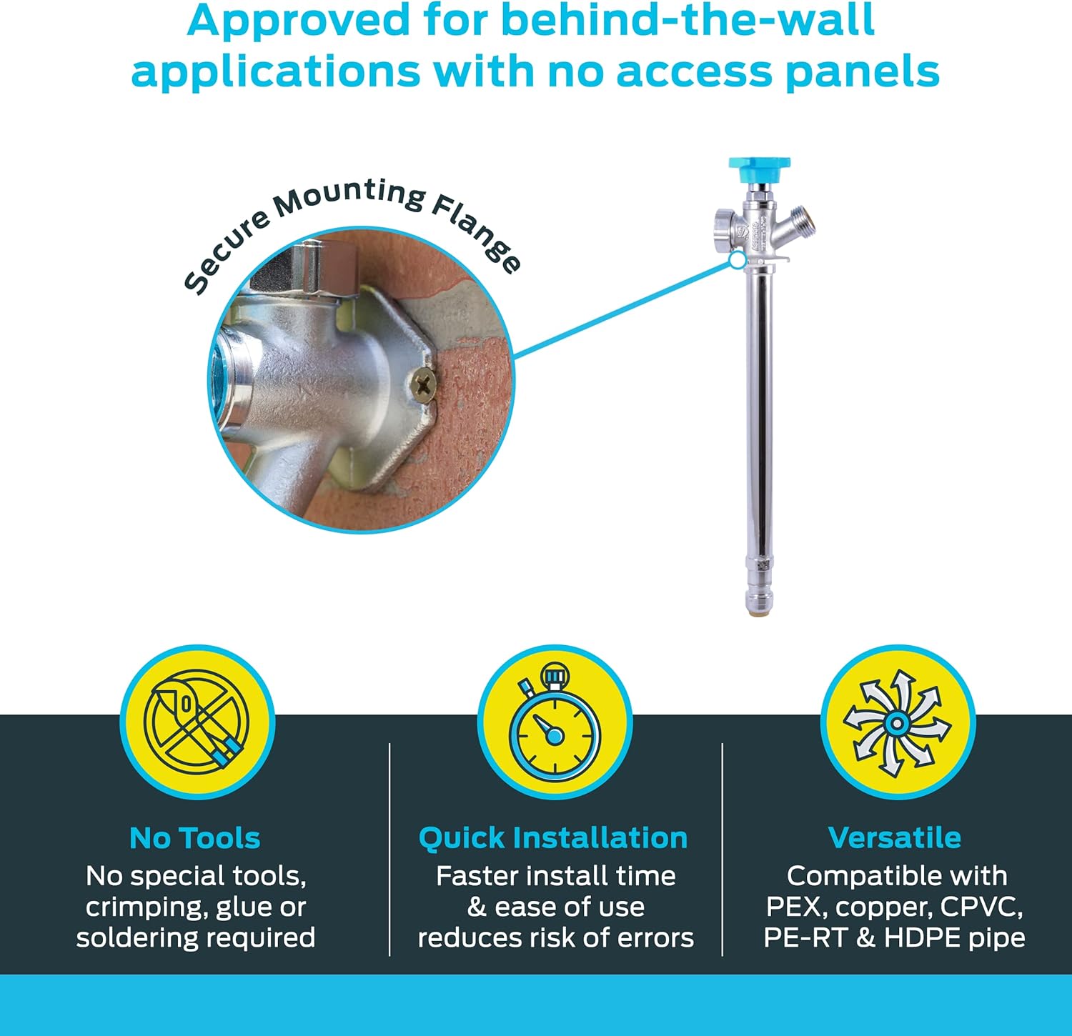 - VERSATILE: Push-to-connect sillcocks work well with PEX, CPVC, PE-RT, SDR-9 HDPE, and copper pipes; ideal for working in tight spaces