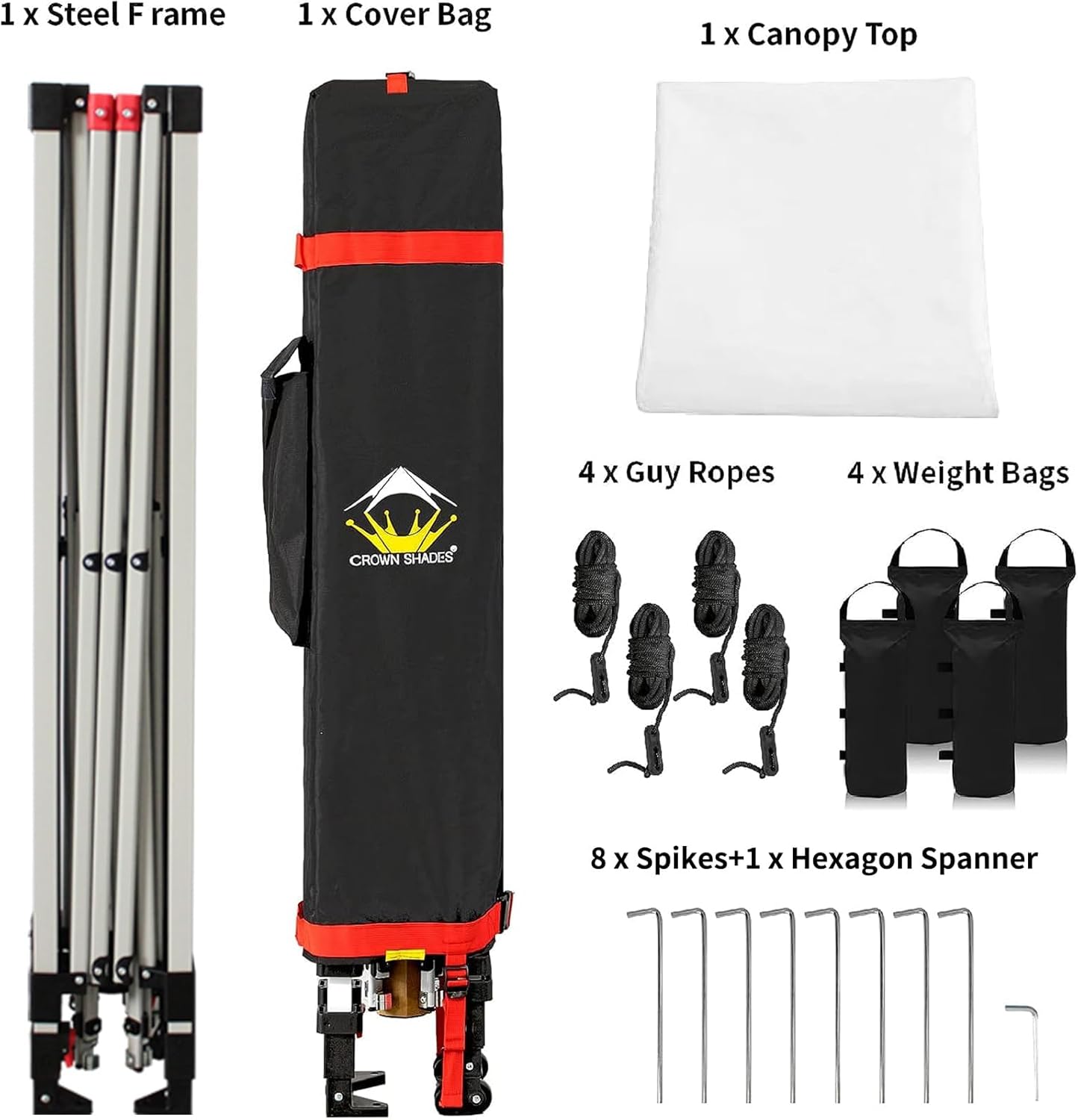 - HIGH GRADE STEEL FRAME - The durable, high-grade, corrosion-resistant steel truss frame with hardened through bolts comes pre-assembled and can be set up without any tools. Engineered to support up to 120 lbs. distributed across the frame, it ensures robust and reliable performance. The extended ceiling assembly and upgraded high peak design make it easier for rainwater to run off, preventing water pooling on the canopy. Perfect for extended outdoor use at markets, festivals, and exhibitions