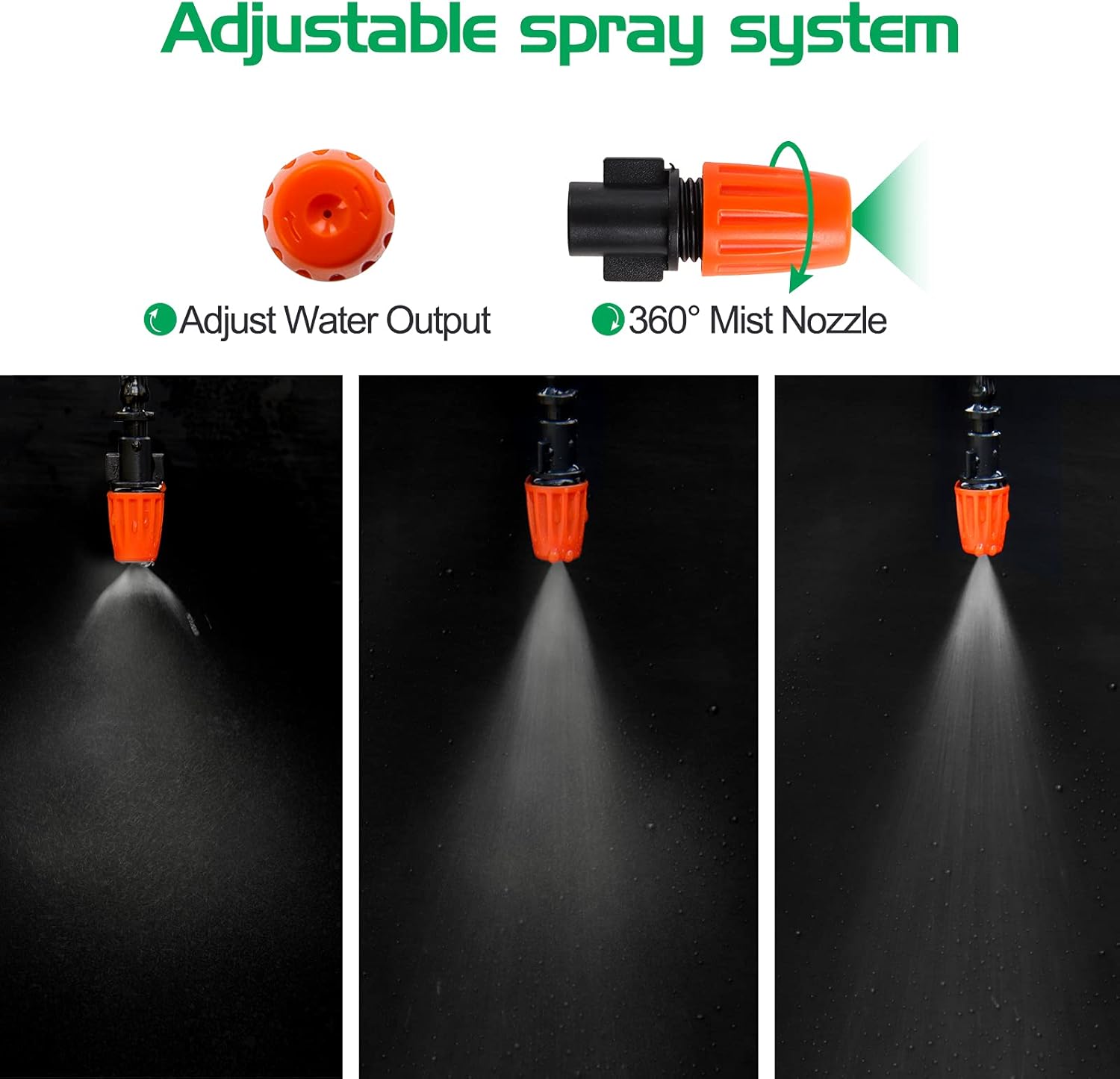 - Flow rate of each mister: 6.7-7 L/Hour, Max spray diameter: 0.3m. Up to 70 percent water savings compared to manual watering.The nozzle has two water outlet modes, columnar and misty, you can adjust the nozzle according to your needs.