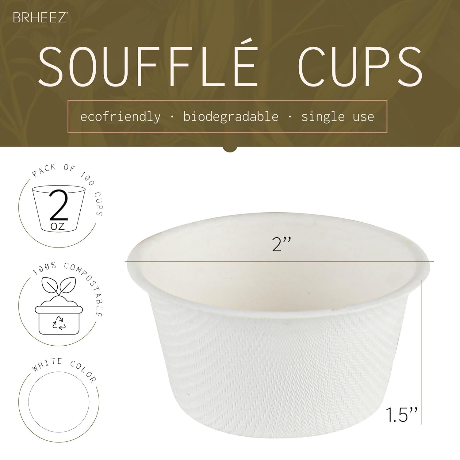 brheez 2 oz - Pack of 100 Disposable Bagasse Fiber Souffle Cups , 100% Natural Biodegradable & Compostable Perfect for Condiments Small Portion & Samples , Eco Friendly Paper Alternative - White