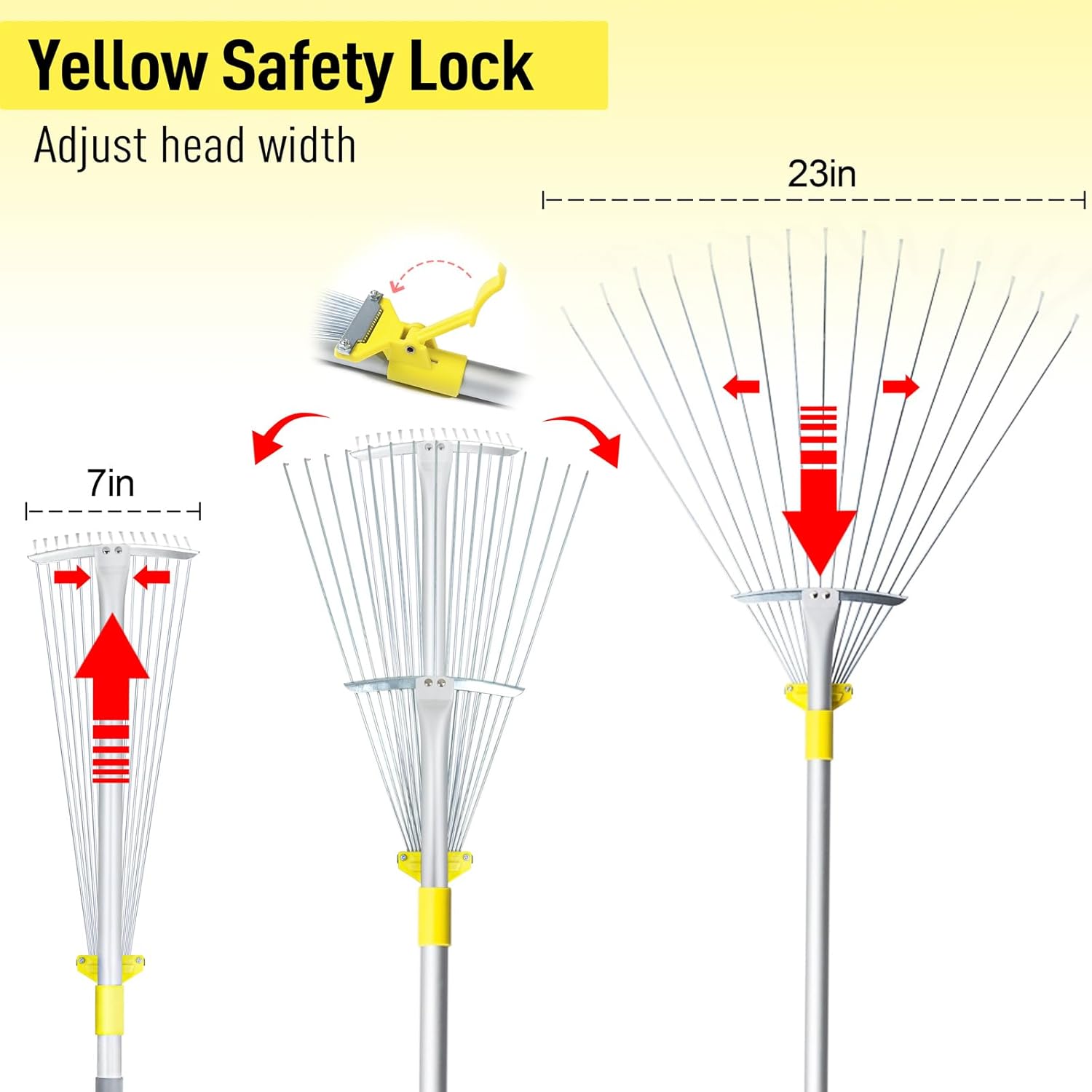 - 【Bigger Leaf Rake Head】- Suitable for Both Wide & Narrow Area. Expand the 7-23" adjustable garden rake head to easily pick up leaves, clippings and loose lawn debris in wide aera. Compact the yard rake for leaves in tight areas like under hedges or between flower beds
