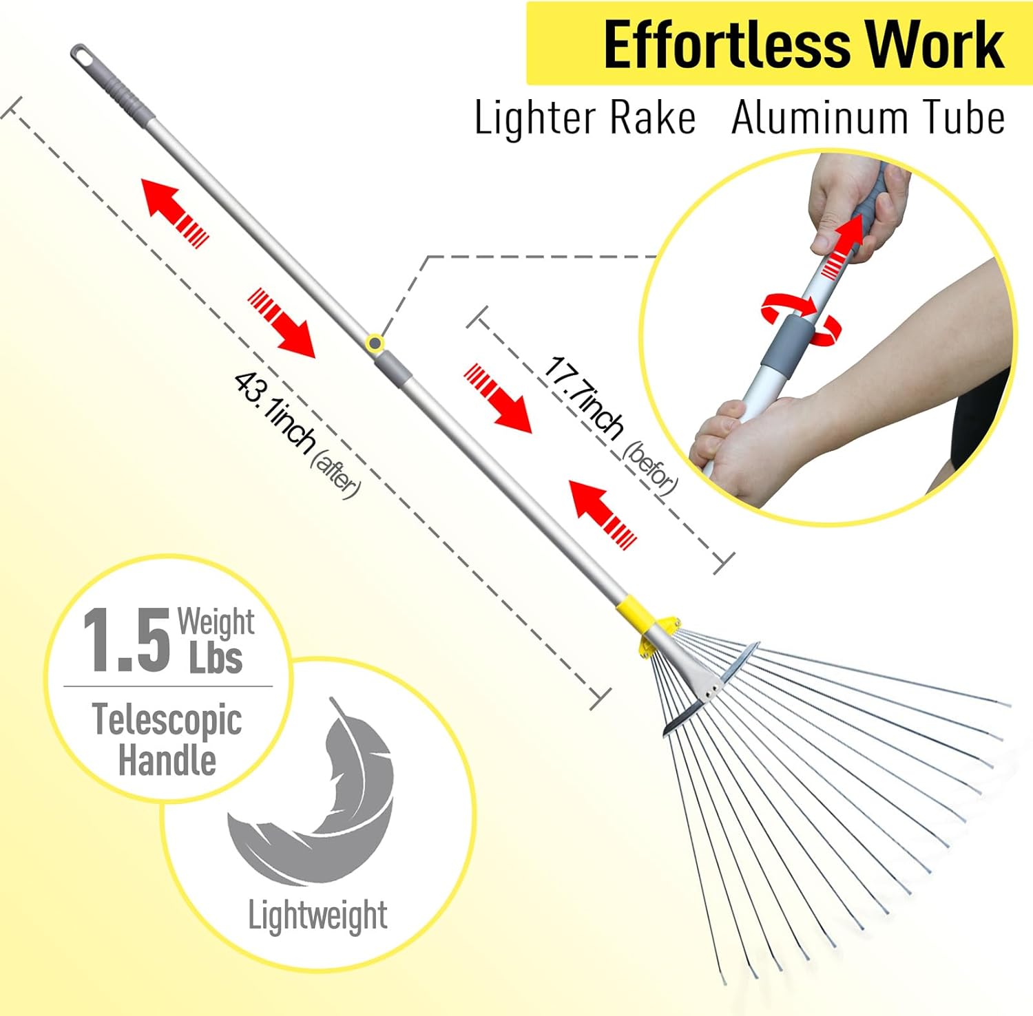 - 【Efficient Raking in Each Pass】- Larger head of this collapsible rake for camping collects more dry leaves in each pass efficiently. Adjust the yard rake head at any width easily in seconds by turning yellow lock anytime
