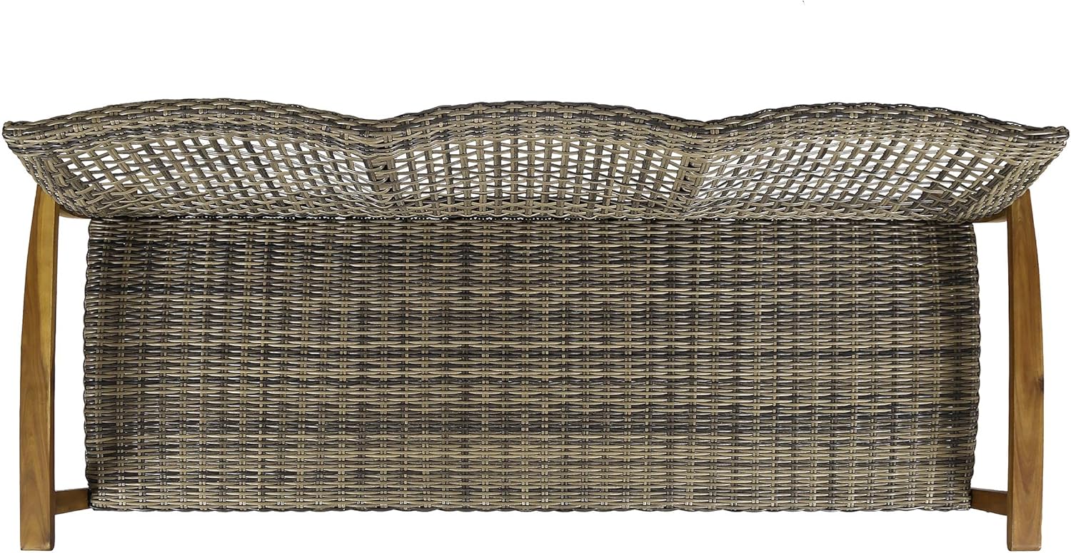 - ACACIA WOOD WITH COMPLEMENTING FINISH: This frame consists of an acacia hardwood that accents the wicker seat. This material is washed with a complementing finish and maintains a sturdy foundation for the sofa that can withstand most weather conditions.