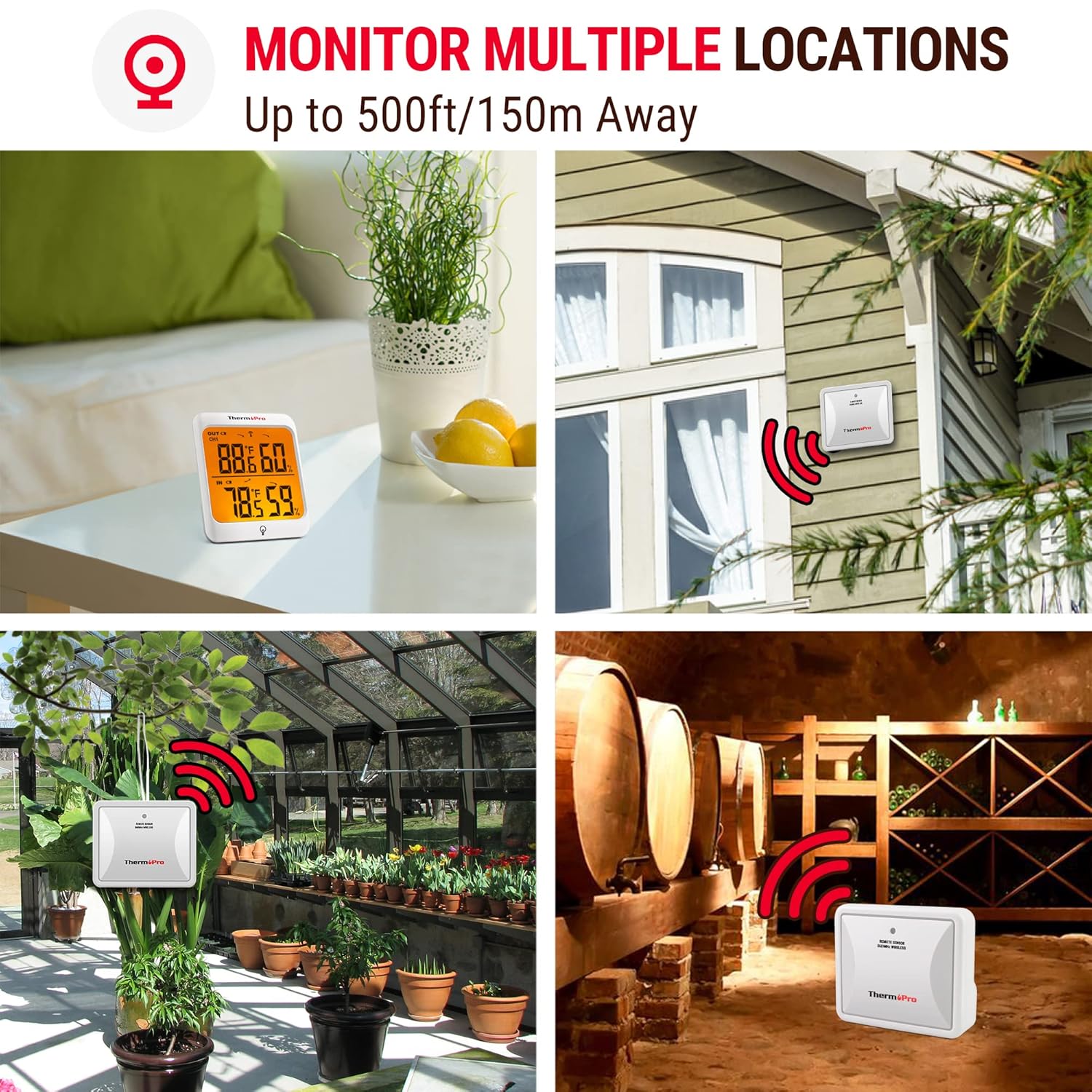 - 500FT Remote Range & Monitor 4 Locations: Wireless outdoor thermometer measures temperature & humidity from 500FT away, track environmental conditions in up to 4 locations with 3 additional temperature sensors