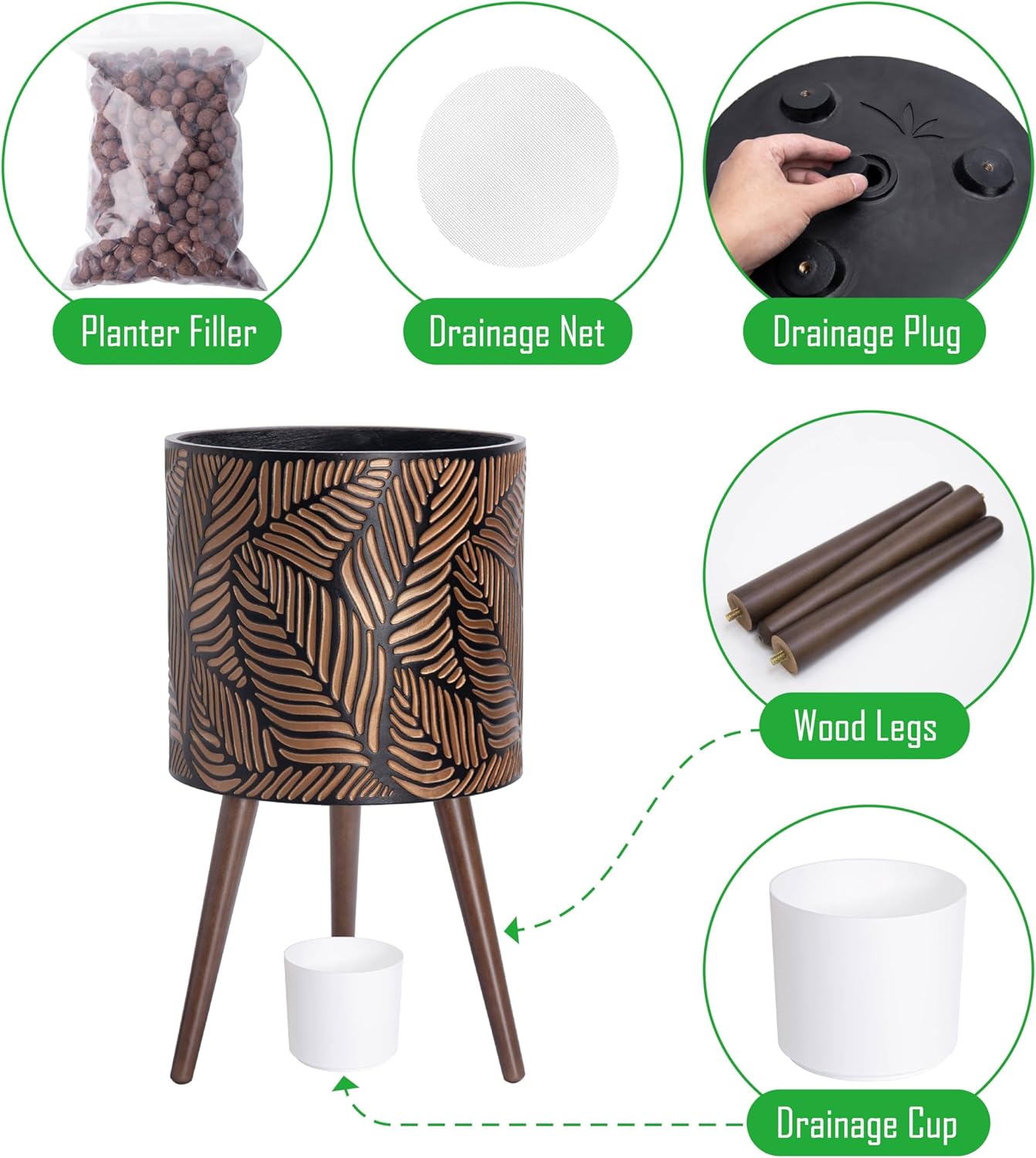 - Whatโs included: planter pot with drainage hole, drainage plug, set of stand โ 3 solid wooden legs.