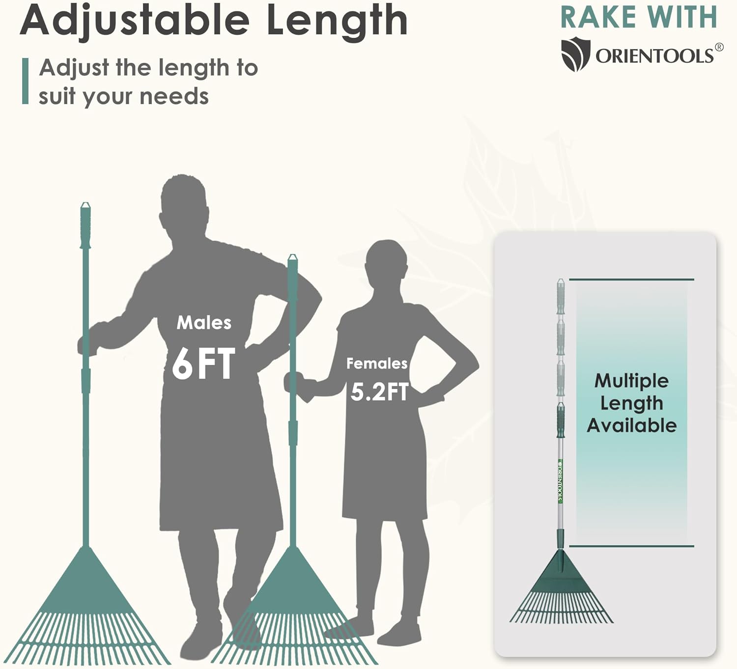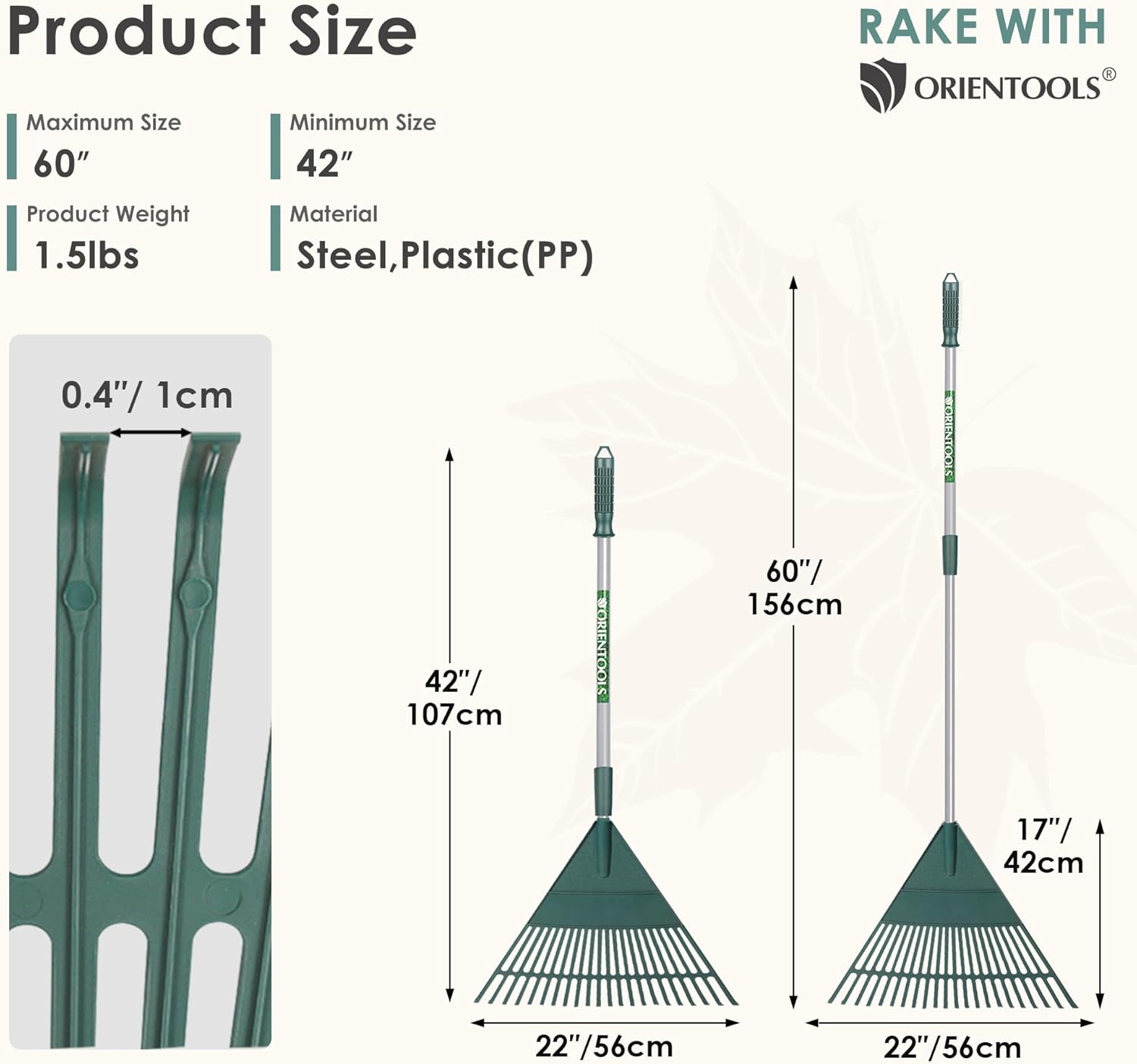 ORIENTOOLS Rake for Leaves,Adjustable Garden Leaf Rake ,Lightweight Steel Poly Yard Rake,22 Tines, 42 to 60 Inches (Silver Handle)
