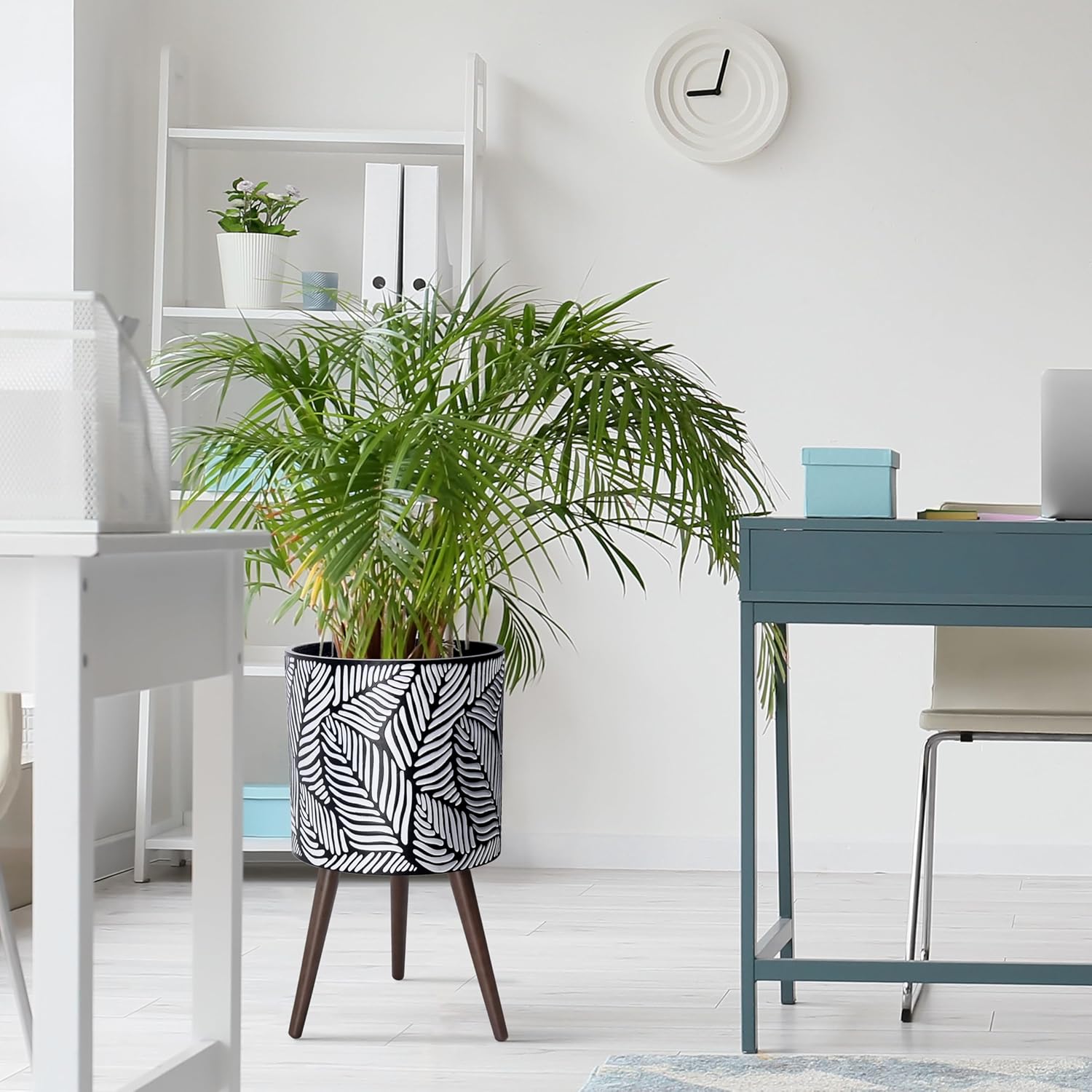 D'vine Dev 14 Inch Planter Pot with Stand, Mid-Century Tall Plant Pot with Legs for Indoor Plants, X-Large, White/Grey, 88-L-D-7