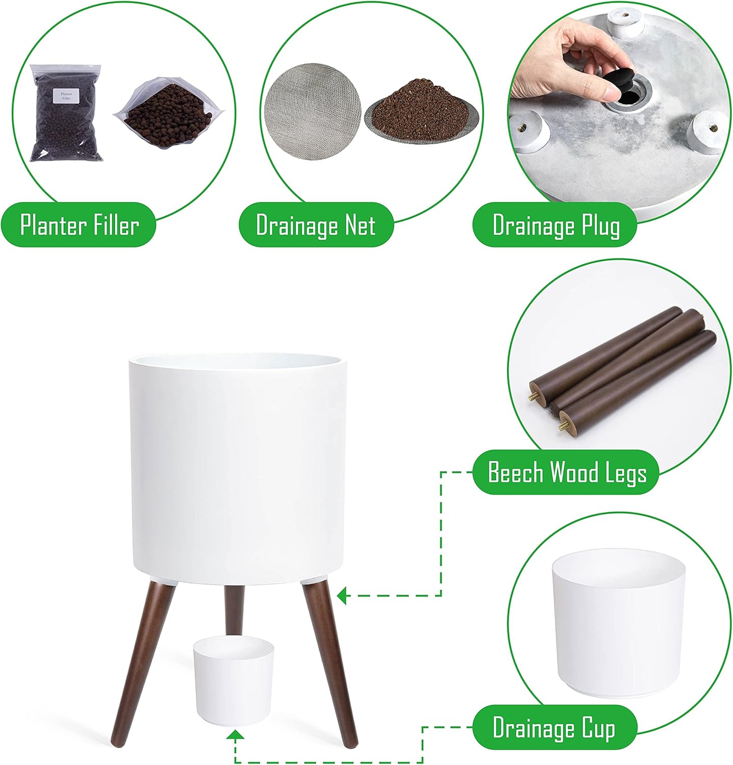 D'vine Dev 12 Inch Planter Pot with Stand, Mid-Century Tall Plant Pot with Legs for Indoor Plants, Large, White, 88-O-C-1
