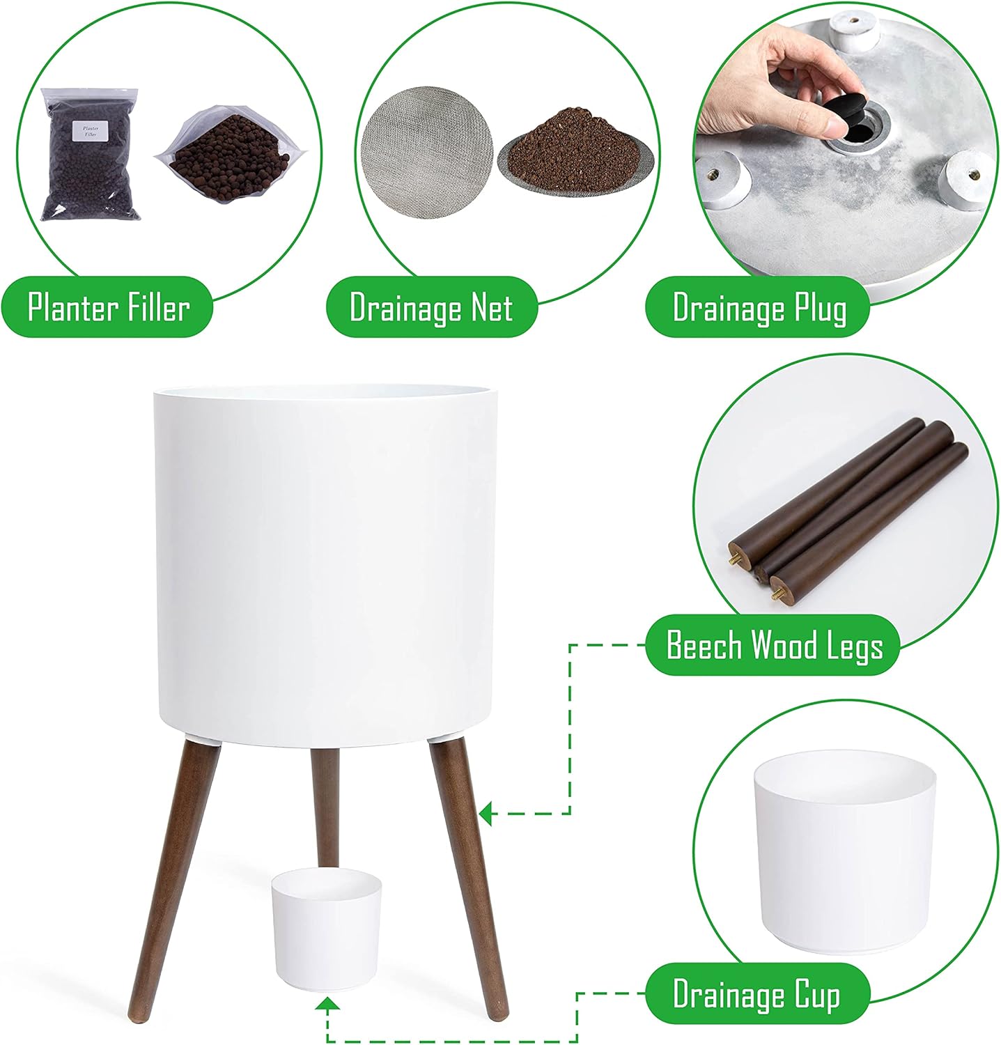 D'vine Dev 14 Inch Planter Pot with Stand, Mid-Century Tall Plant Pot with Legs for Indoor Plants, X-Large, White, 88-O-D-1