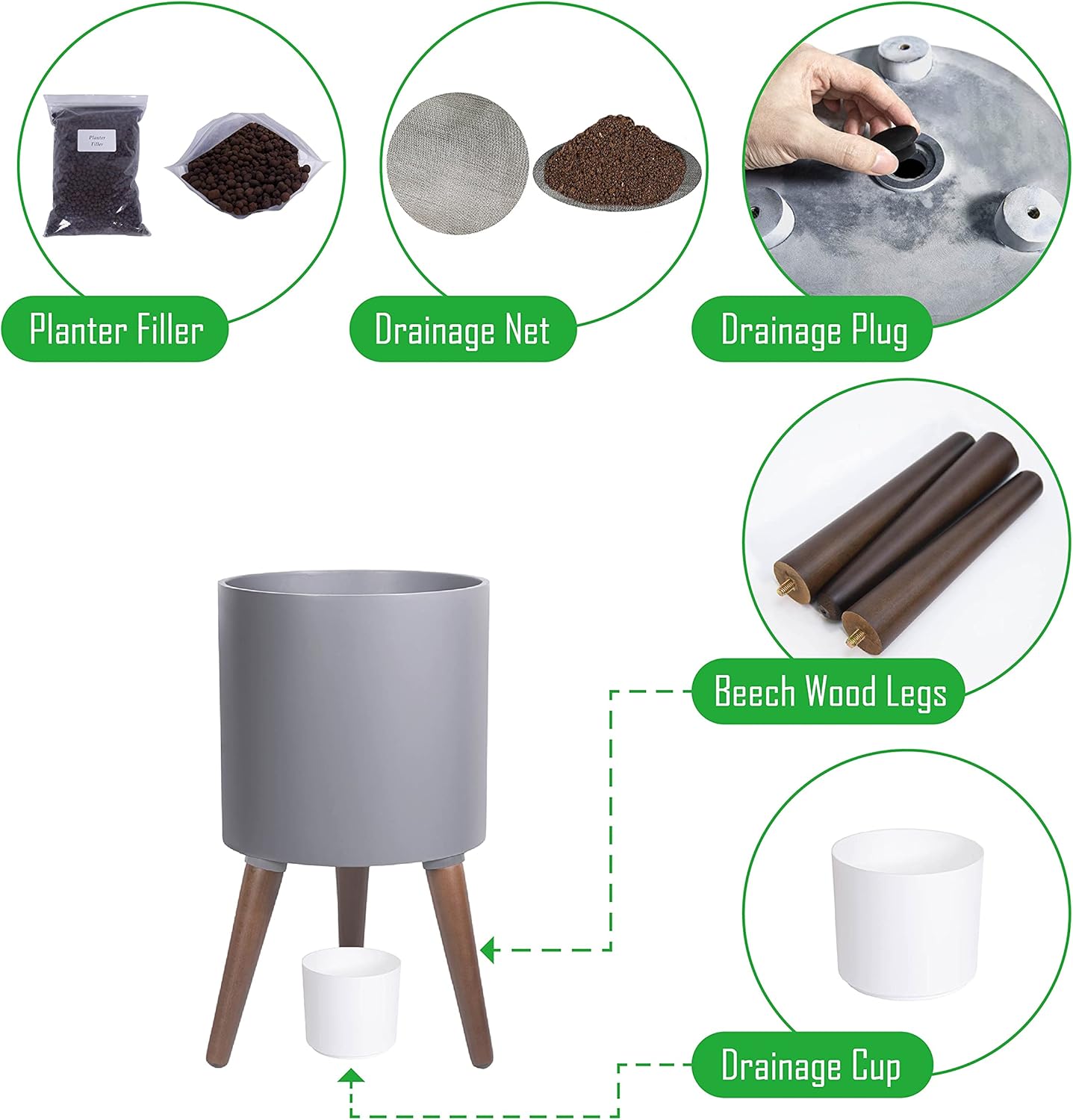 - Plants enthusiast accessories - drainage mesh net, optional plug, water catch cup, small bag of ceramic plant fillers.