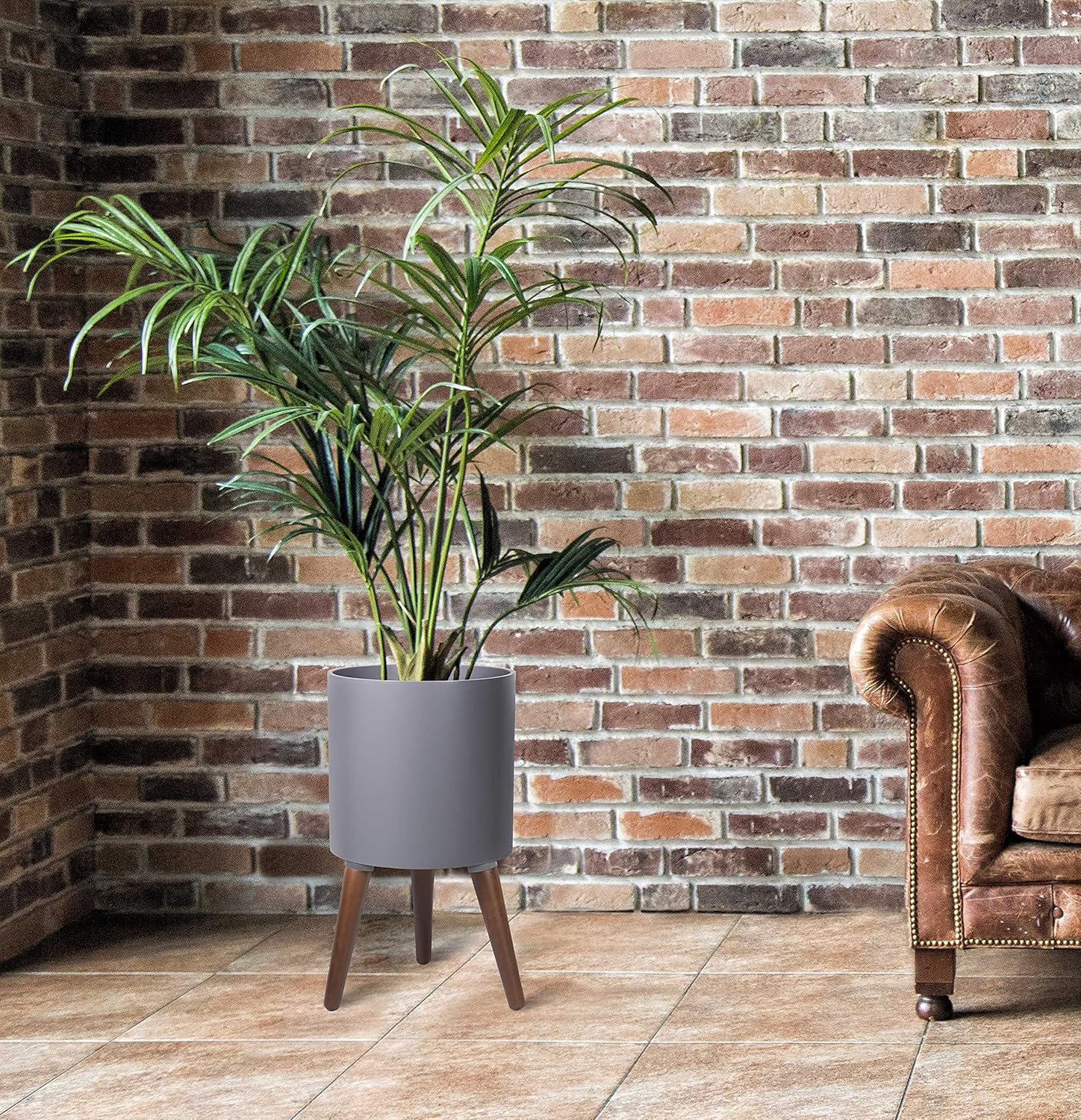 - Handcrafted durable fiberclay modern planter pot with stand - wooden legs – mid-century walnut color finishing.
