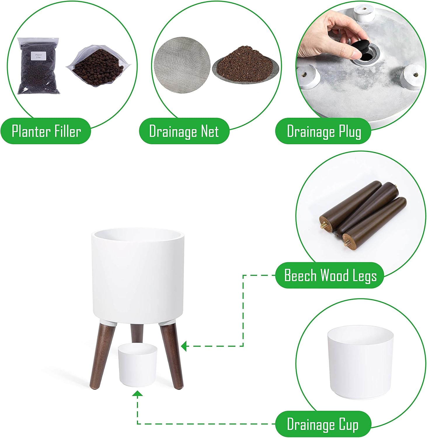 - Plants enthusiast accessories: Drainage mesh net, optional plug, water catch cup, small bag of ceramic plant fillers.