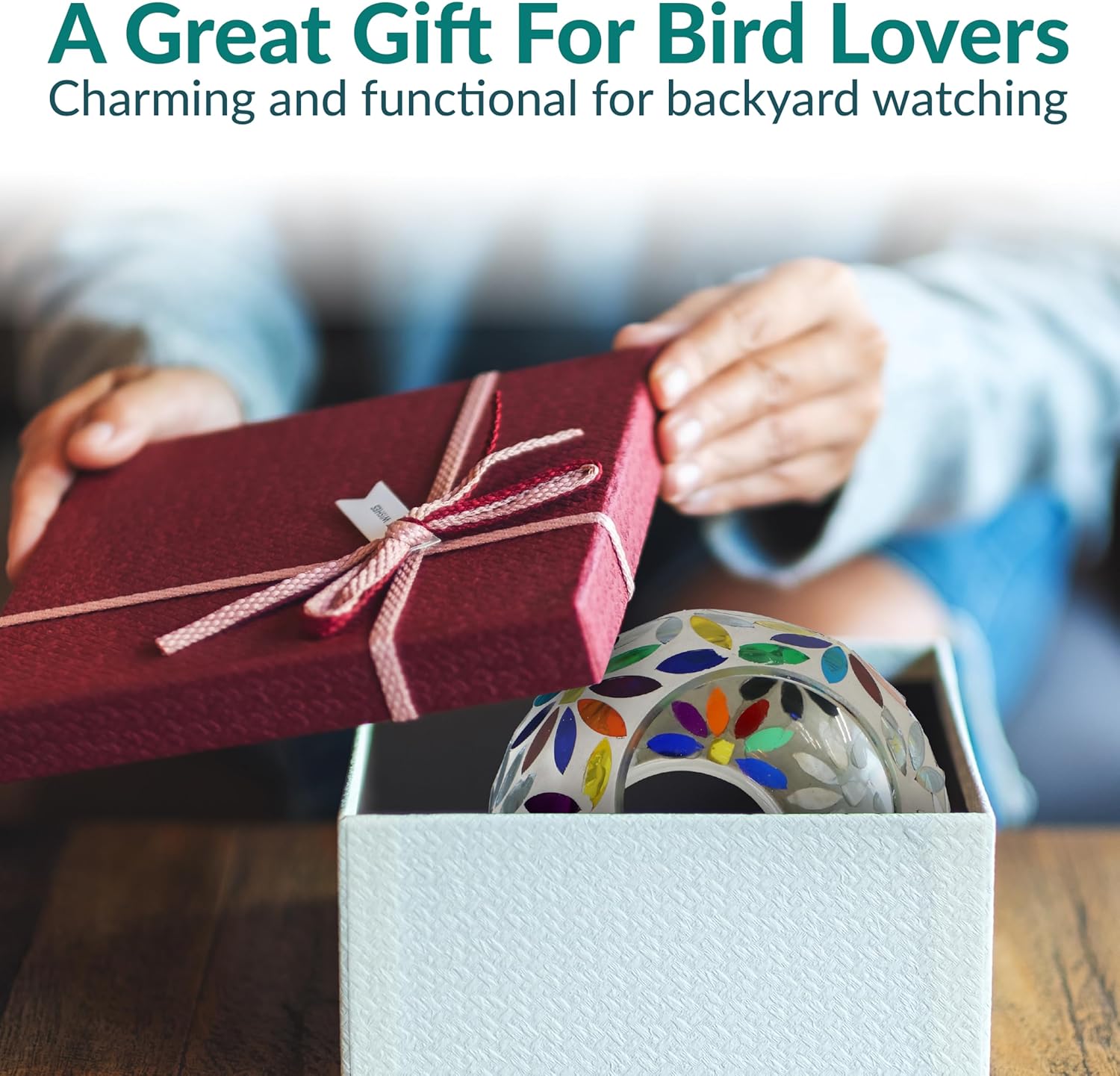 - ATTRACT BIRDS TO THE YARD: This cute bird feeder features vibrant colors and a mosaic glass construction that is sure to appeal to humans and birds alike. The bright colors and reflective material will help attract a variety of bird species to the feeder including cardinals, finches, sparrows, and more. Plus, it will add a stylish pop of color to any patio decor. The open fly-through design also makes it easier for birds to access the seed, encouraging them to come back again and again.