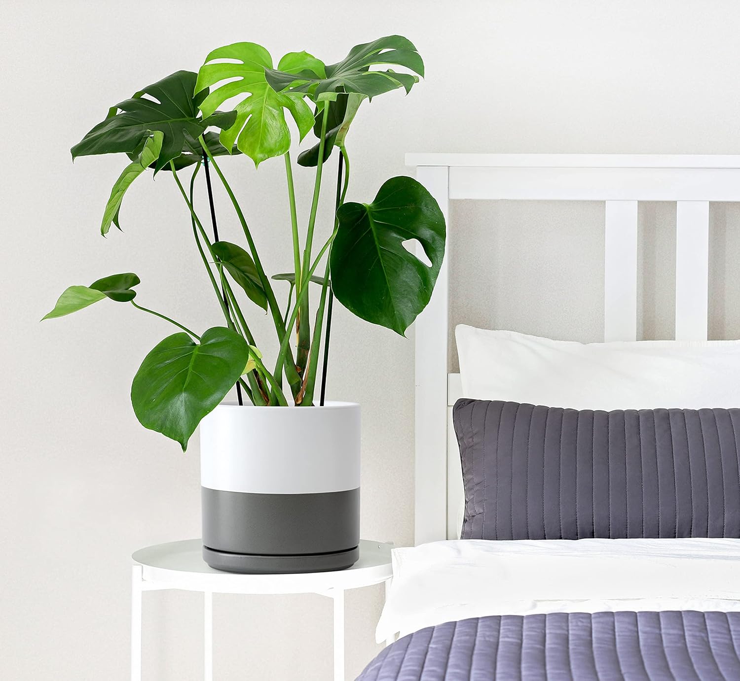- Simple, elegant, and modern cylindrical straight round planter pot with saucer and drainage hole.