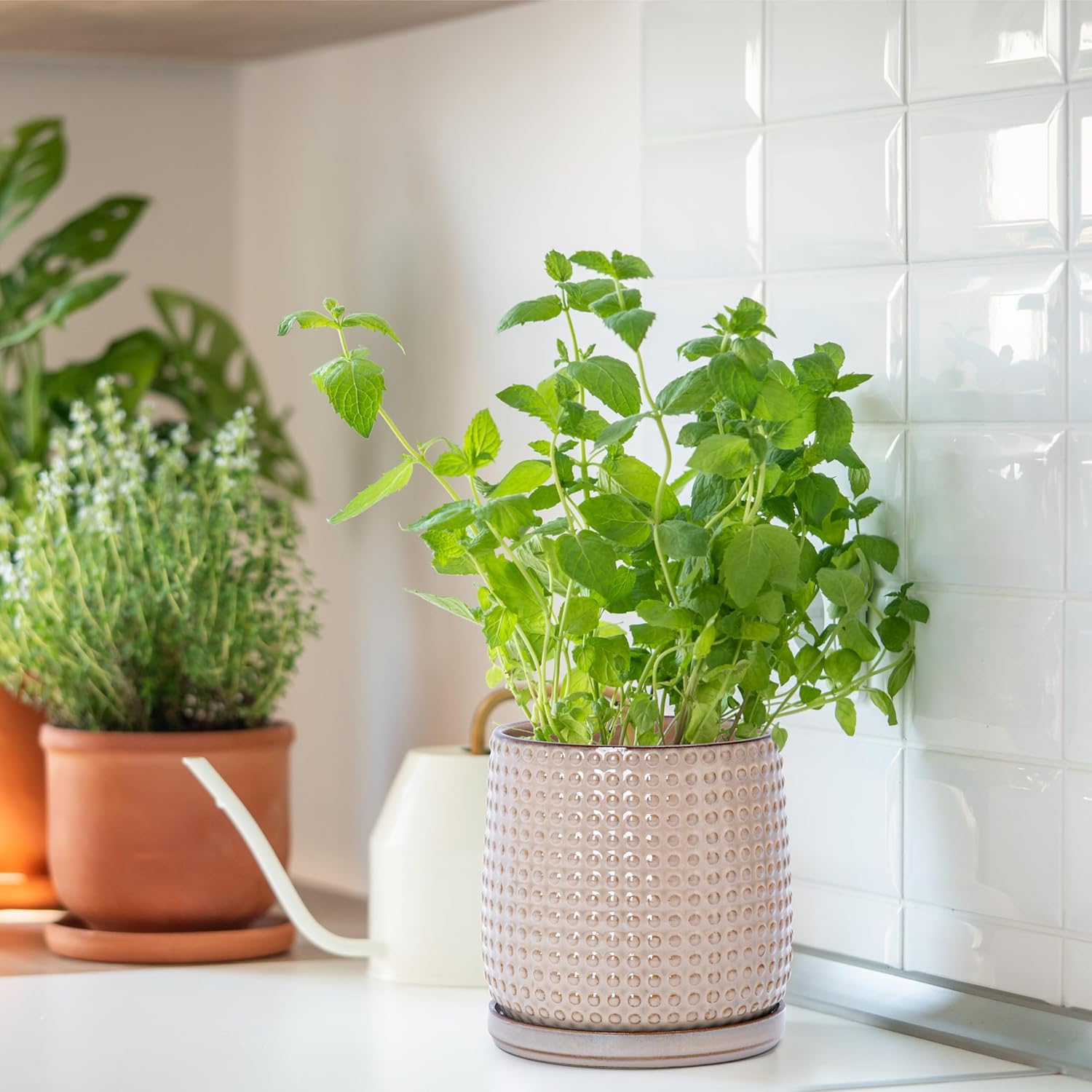 D'vine Dev 6 Inch Ceramic Beaded Stoneware Planter Pot - Flower Pot with Drainage Holes and Saucers for Indoor Succulent Plants or Flowers, Light Brown, 27-C-X-4