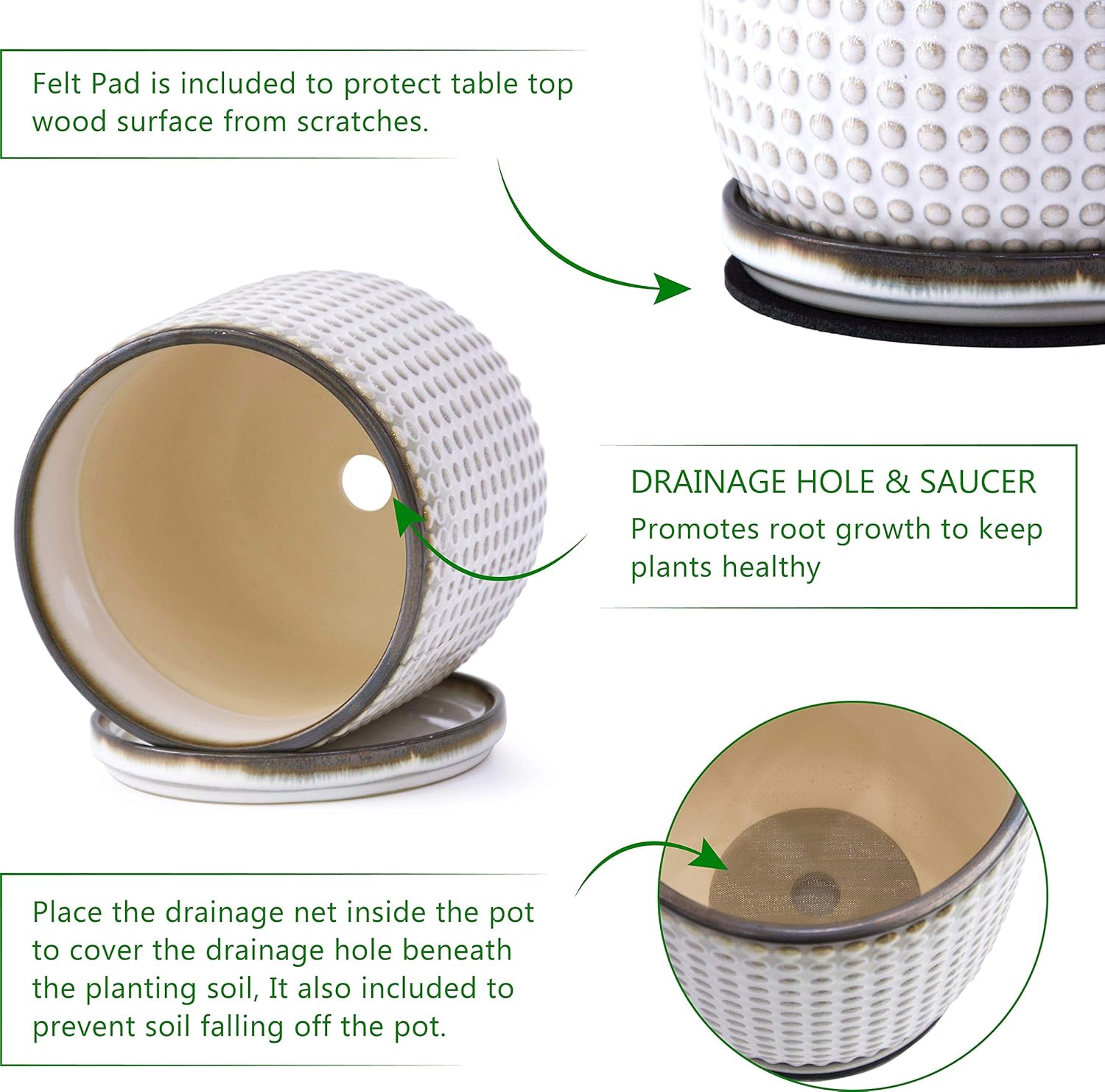 - >> Drainage Net and Pad - A stainless-steel drainage mesh net is also included to prevent soil from falling off the pot. Another protective pad is included to protect tabletop wood surface from scratches.
