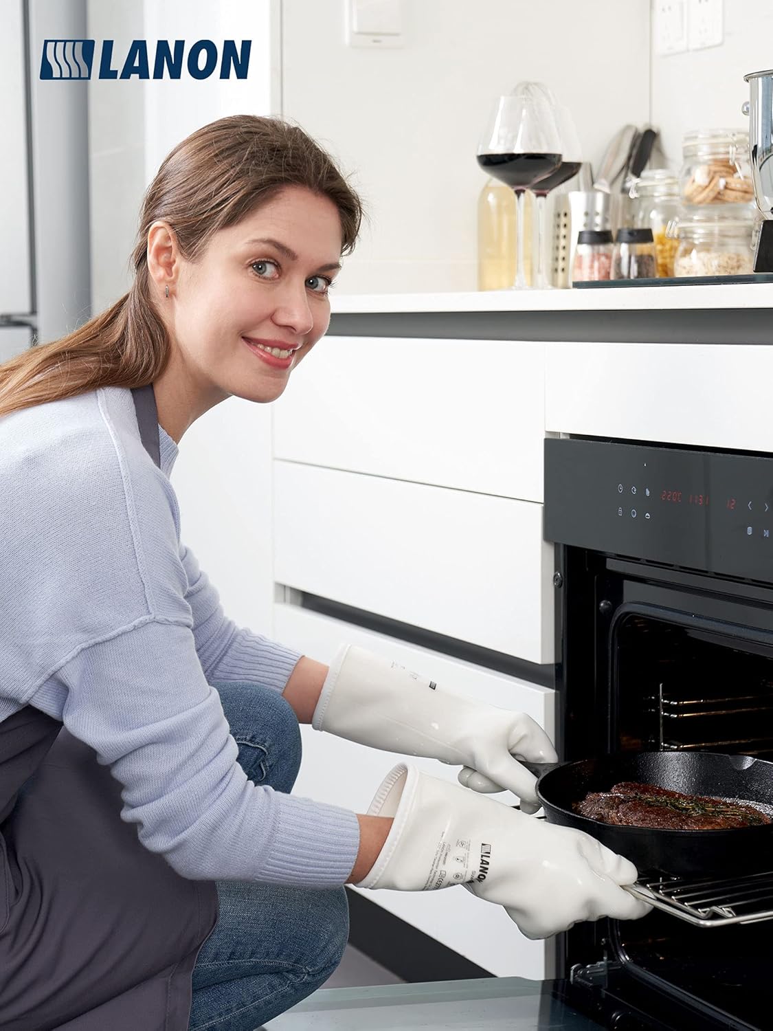 LANON Liquid Silicone Gloves, Heat Resistant Oven Gloves with Fingers, Food Grade, Waterproof, White, XL