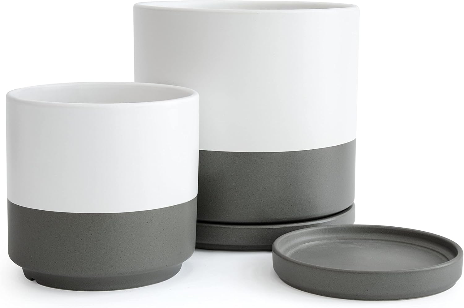 D'vine Dev 6 Inch & 8 Inch Ceramic Planter Pots for Plants with Drainage Hole and Saucer, Medium Plant Pots Set, White/Speckled Grey, 94-G-M-6