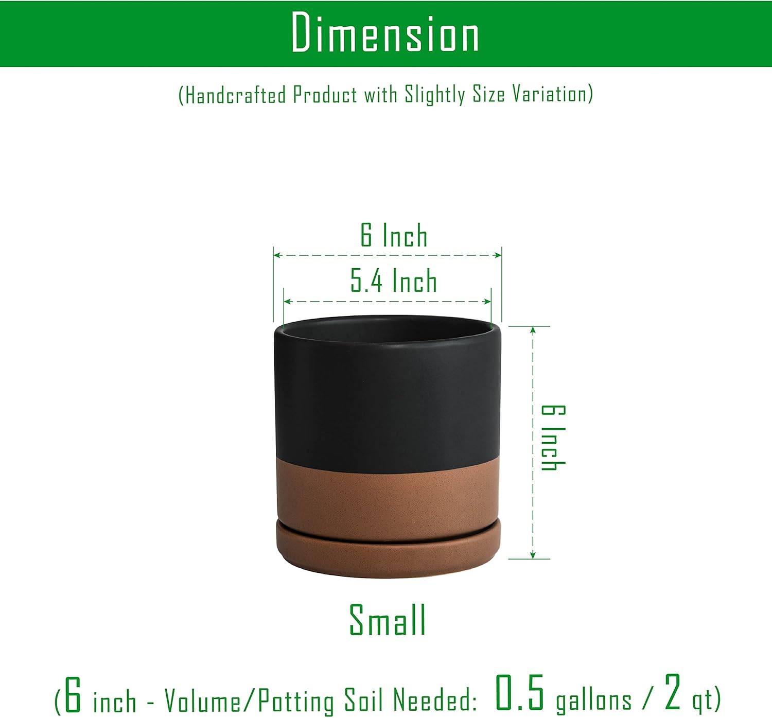 - Small 6 Inch Planter Pot: 6" Diameter x 6" H, black & speckled tan/brown color. Potting Soil Needed: 0.5 gallons / 2 qt.