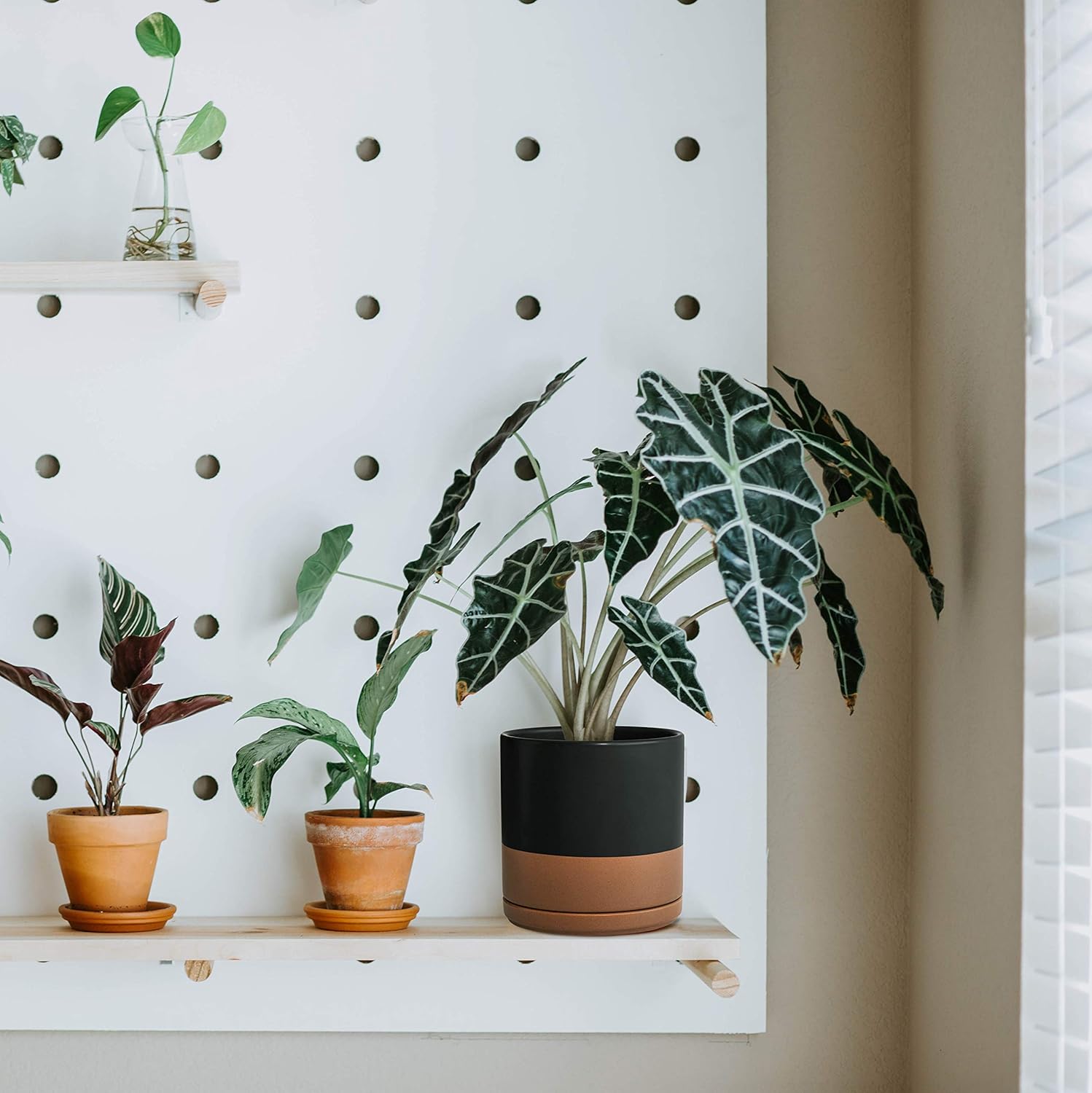 D'vine Dev 6 Inch Ceramic Planter Pot with Drainage Hole and Saucer, Indoor Cylinder Round Planter Pot, Black/Speckled Tan, 94-O-C-7