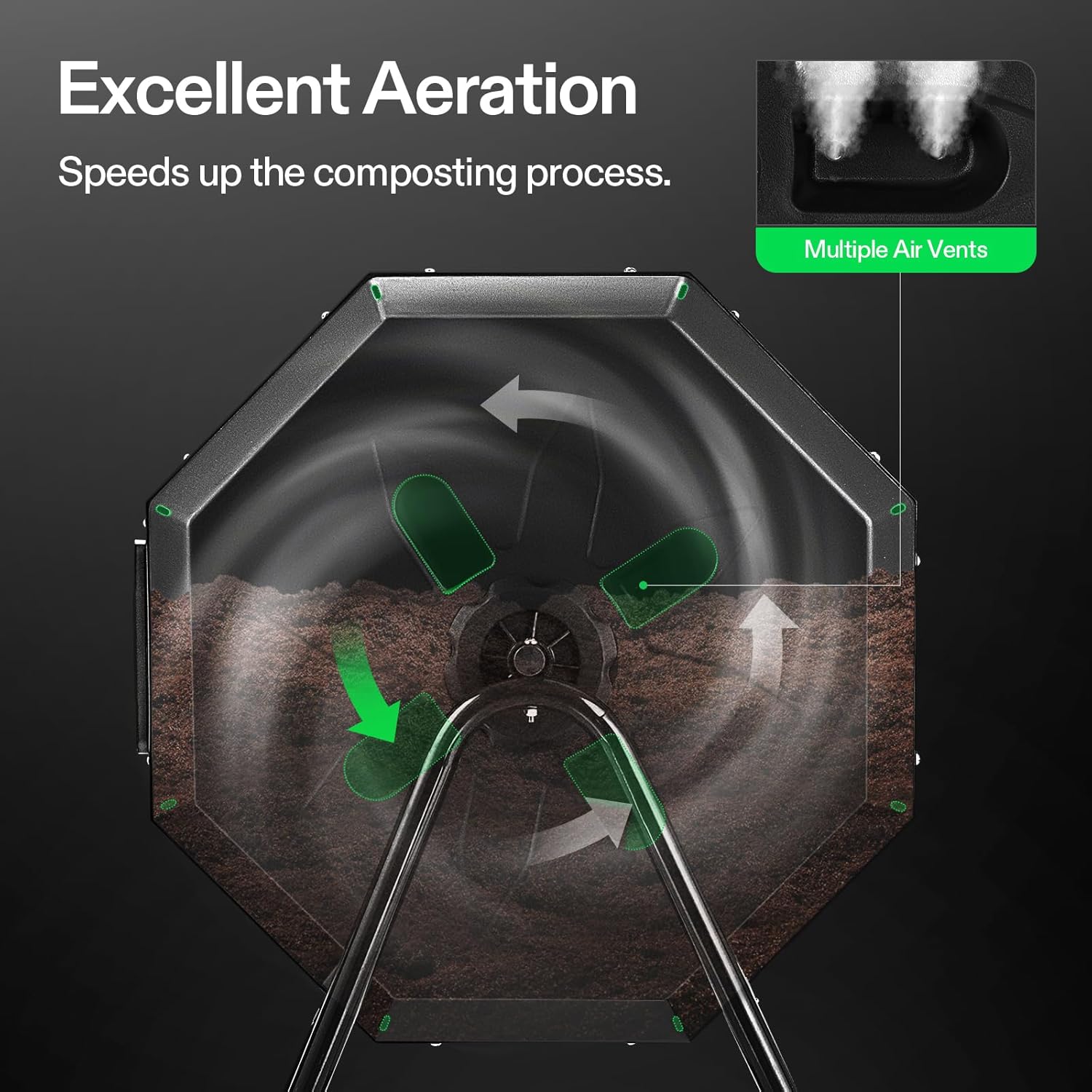 - 360β° Tumbling Design: The rotating design prevents you from digging or mixing the pile by hand; And the deep fins on eight panels make it easier to turn the compost bin