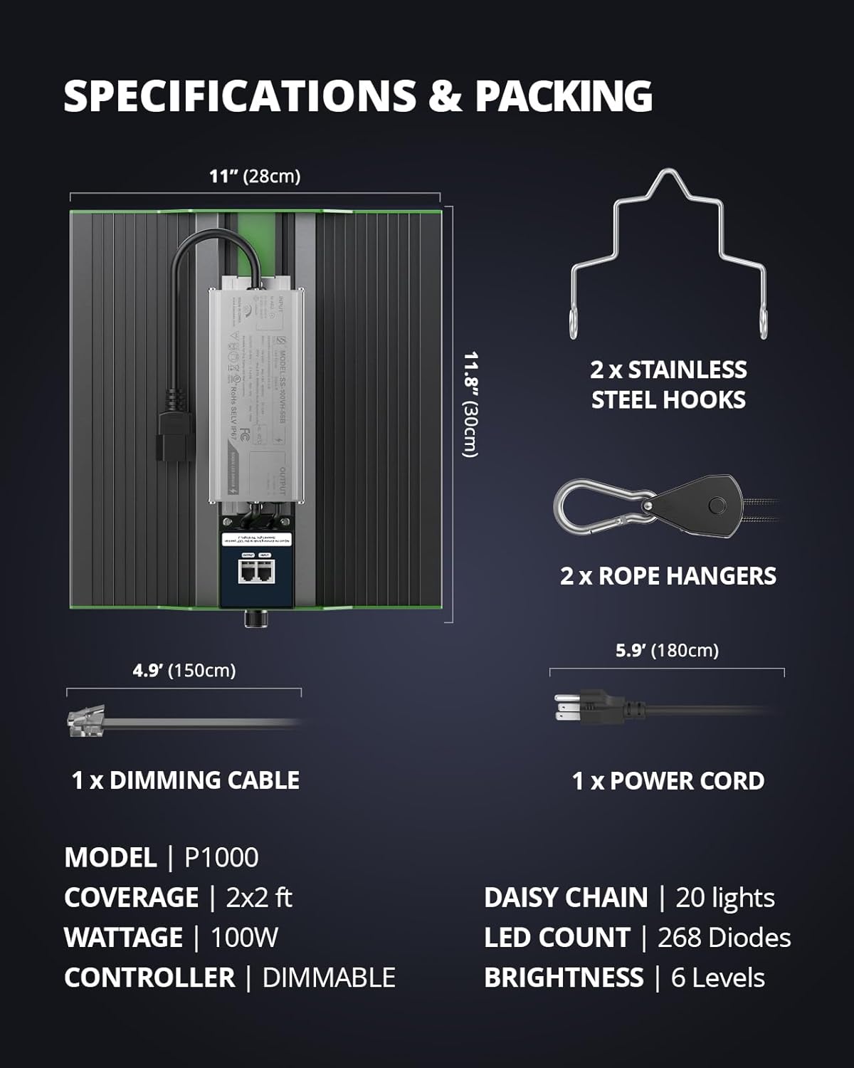 - DIMMER FUNCTION & DAISY CHAIN FEATURE: An added dimmer knob is featured to precisely manipulate the brightness level of the light, obtaining perfect growth performance for each growing phase. Daisy chain feature allows you to connect up to 20pcs P1000 grow lights for your commercial growing, horizontal and vertical farming, greenhouse planting and hydroponics etc.