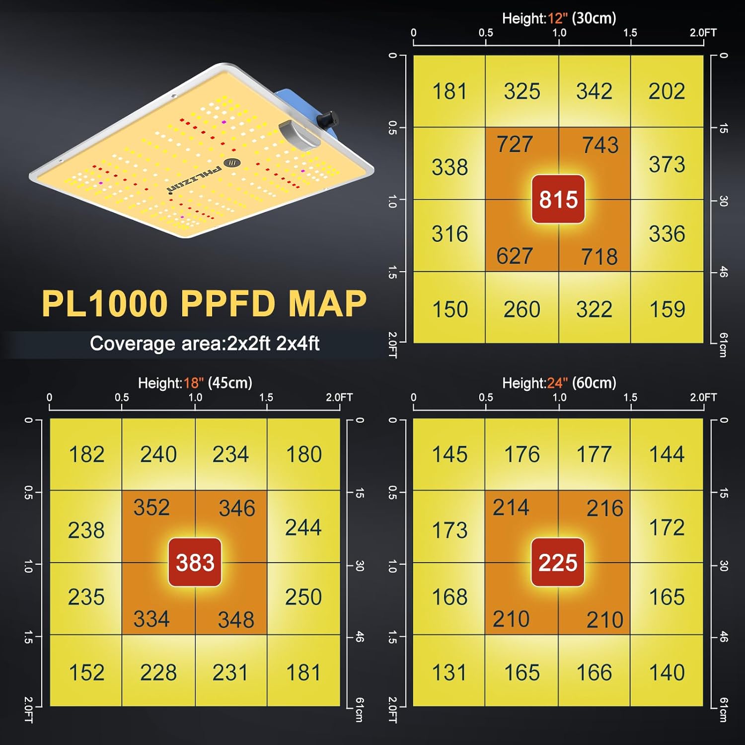 - ENERGY EFFICIENCY-The grow light compares to traditional 1000W HPS/MH while consuming only 100W!, light efficacy is up to 2.8 umol/W, light output PPFD value is 500 umol/mยฒ hanging at 18", grow light is designed to replace tranditional HPS , lower temperature , more scientifically and energy-efficient. making you get 30% higher yield than HPS. Perfect for 2x2ft 3x3ft 2x4ft growing area, higher intensity in a Phlizon mylar grow tent