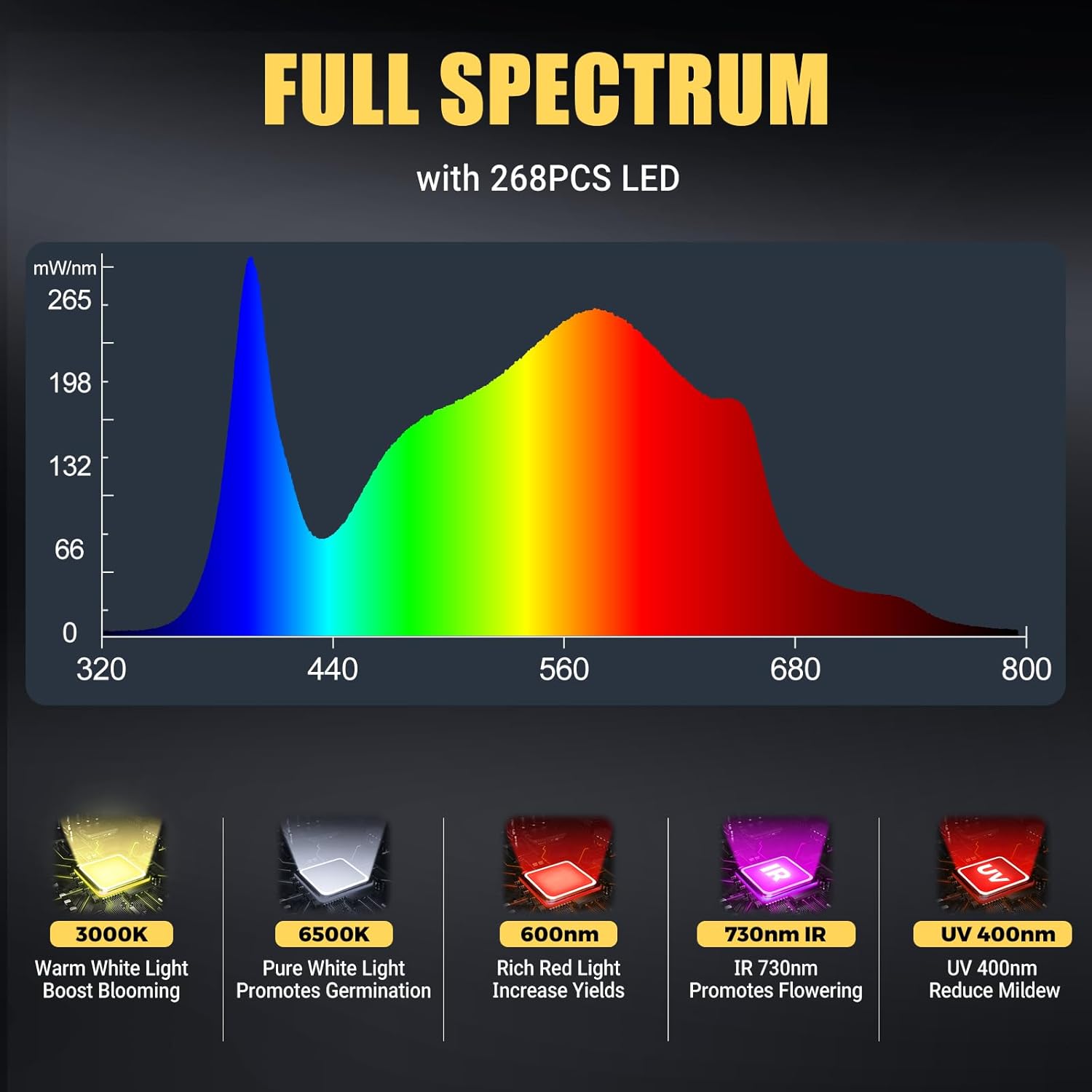- UV IR LEDS & DIMMABLE DESIGN- The intensity of light can be adjusted according to the needs of the plants. The 268pcs leds containing UV IR leds are all LM281B leds chips, It also has higher light intensity, less light decay , better energy saving and PAR values. It contains 150pcs 3000K leds ,86pcs 6500K leds, 24pcs 660nm red leds, 4pcs UV leds , 4pcs IR leds