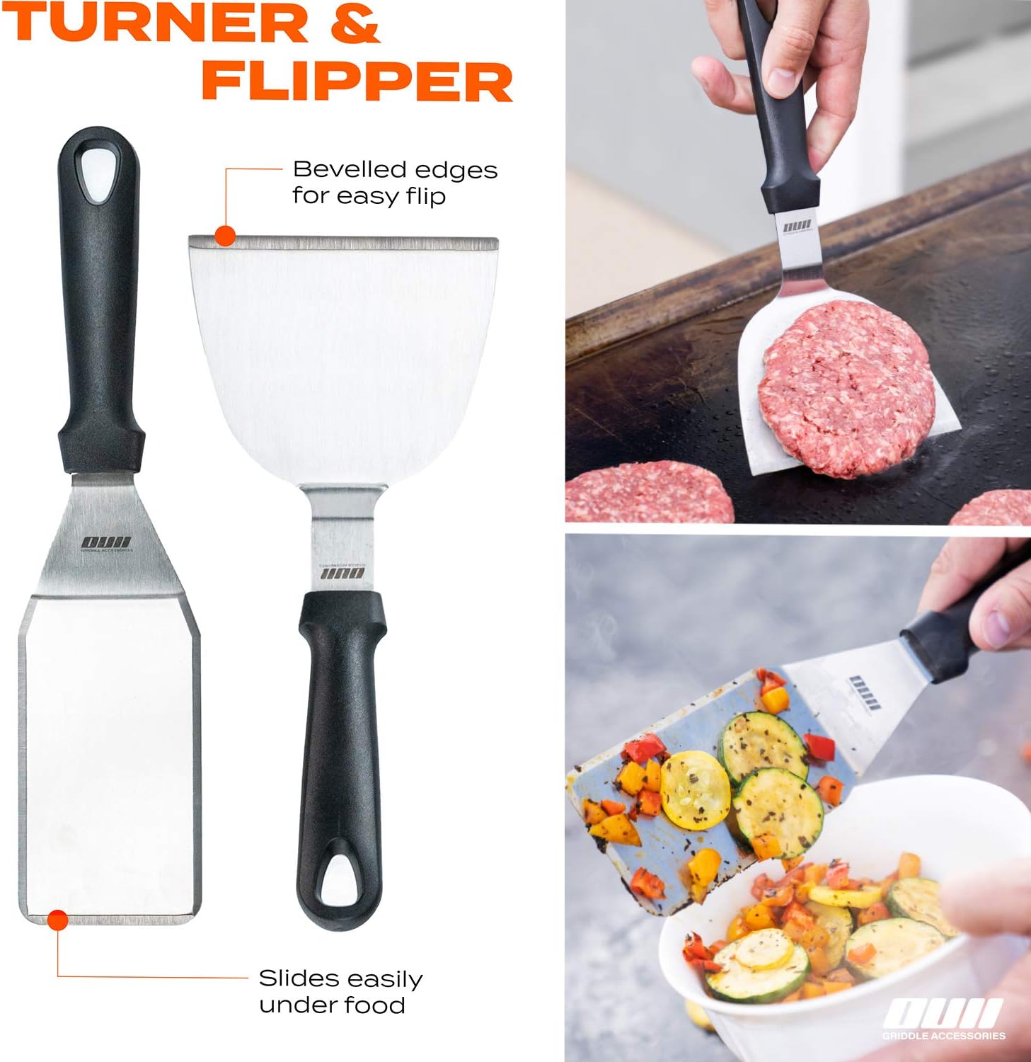 - ⭐ Now, Get It Clean: Efficient Cleaning Tools for the kit! 1x Heavy Duty Griddle Cleaner Scourer with strong handle and 1x griddle scraper with comfy heat resistant handle and sharp rust-resistant stainless steel blade. Everyone knows you can’t create a tasty burger, crispy hash browns or tasty cuisine on a grimy griddle. So OUII created a set of flat grill tools that cooks delicious food from start to finish!