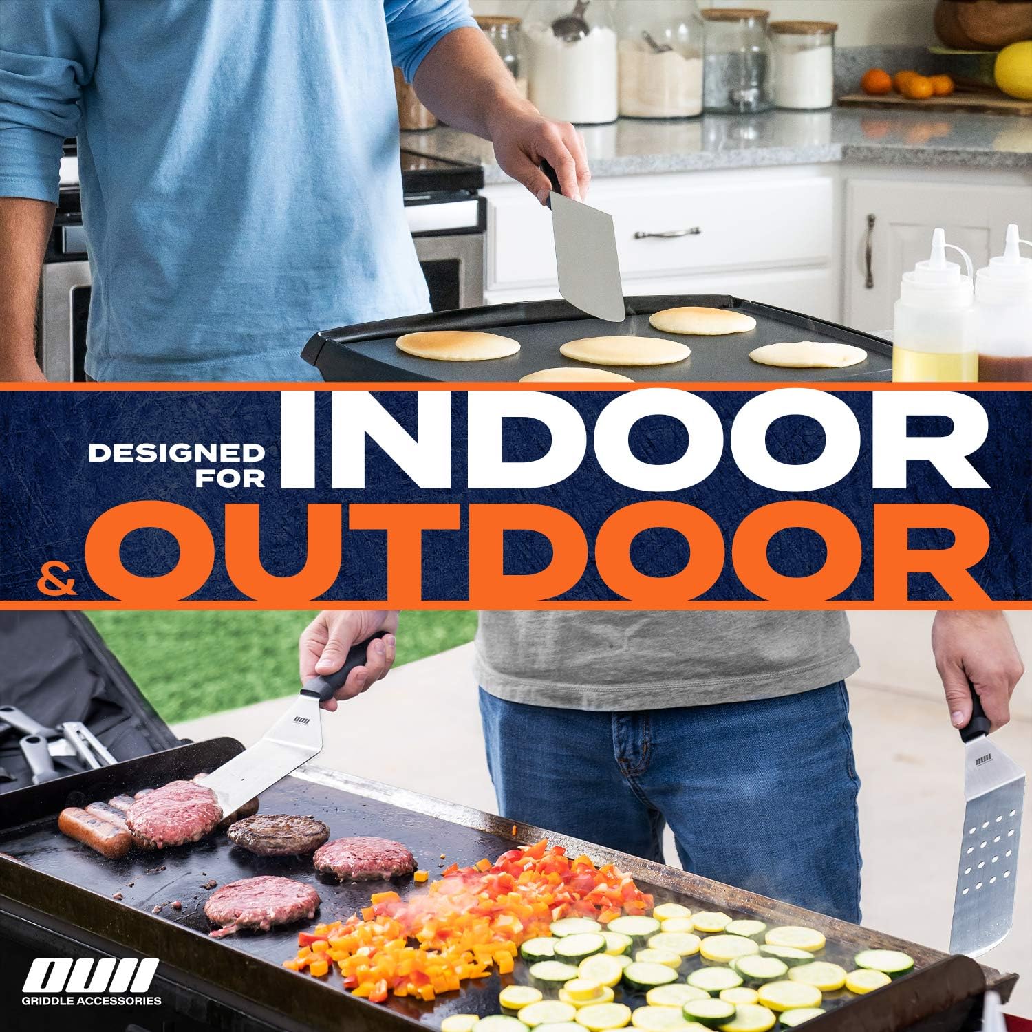 - ⭐ Pack It Away! All your tools are Dishwasher Safe! Once clean, store them away in your 18x9” Griddle Accessories Case. With a double carry handle and wide opening, it fits everything! – tongs, griddle spatula trio, burger spatula metal chopper, egg cooker ring, scraper n scrubber, and squeeze bottle duo. So why not try out The OUII Flat Griddle Set now… because delicious food starts right here!