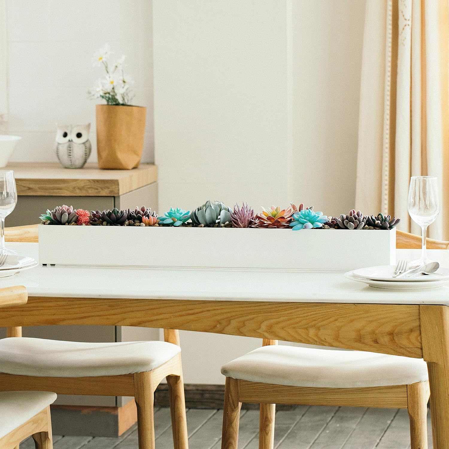 - Modern room decor: Our stylish rectangular planter box makes a decorative statement on its own. It is simple yet elegant. This minimalist design has been powder coated with a pure white easy to clean finish. This finish is resistant to scratches, chips and fading. It is perfect to elevate and blend into any home décor! Please note that plants and rocks are not included.