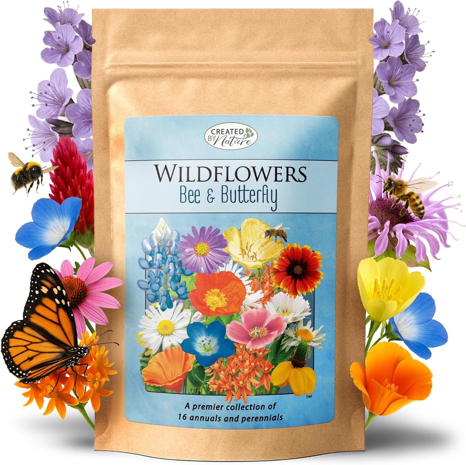 Created By Nature Bee & Butterfly Wildflower Seed Mix, 16 Varieties, 30,000 Seeds
