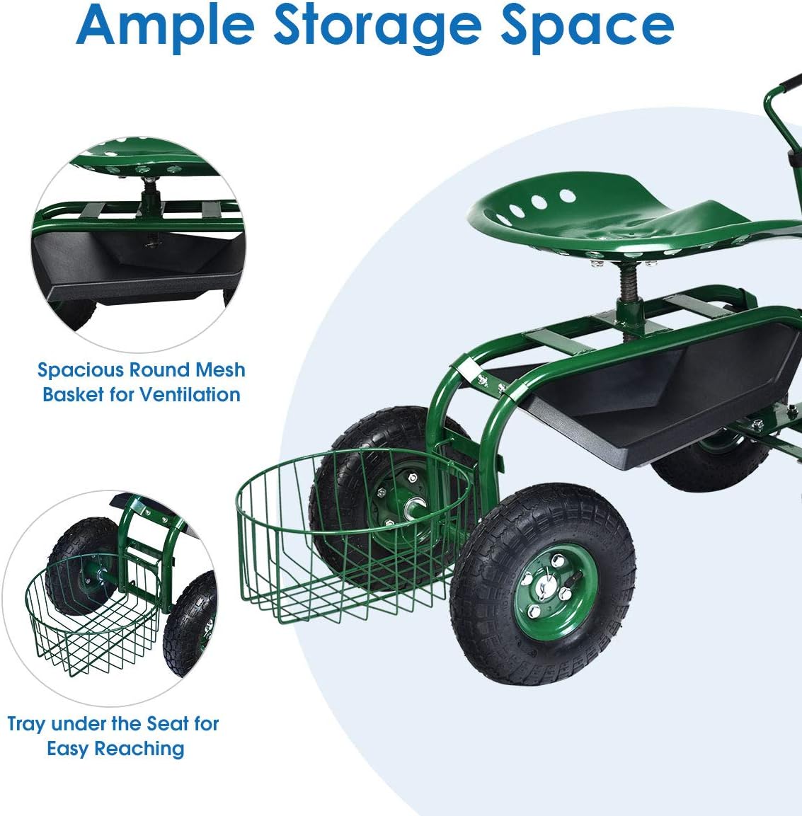 Goplus Rolling Garden Seat with Wheels, Outdoor Gardening Scooter with 360° Swivel Seat, Tool Tray & Basket, Adjustable Steering Handle for Lawn, Gardening Stool, Garden Cart for Planting