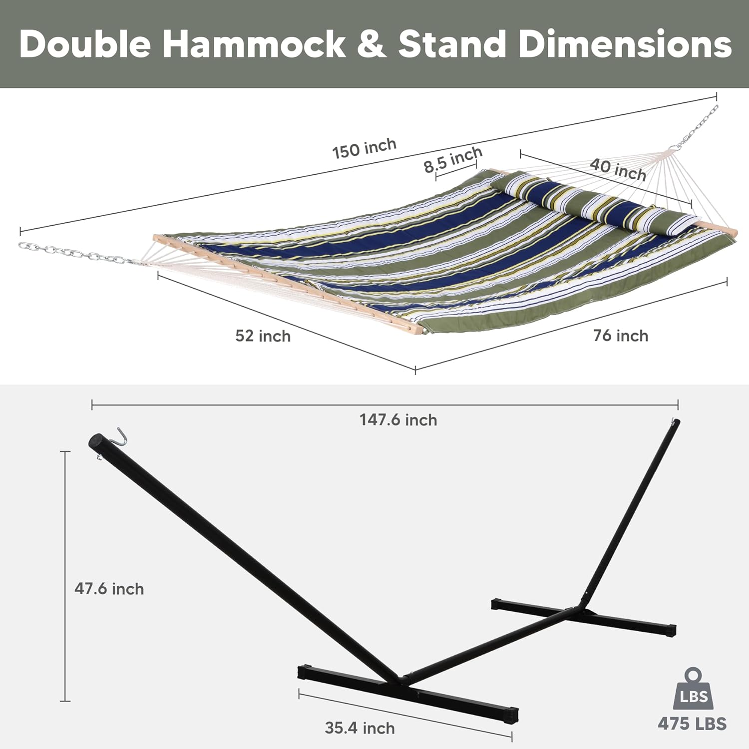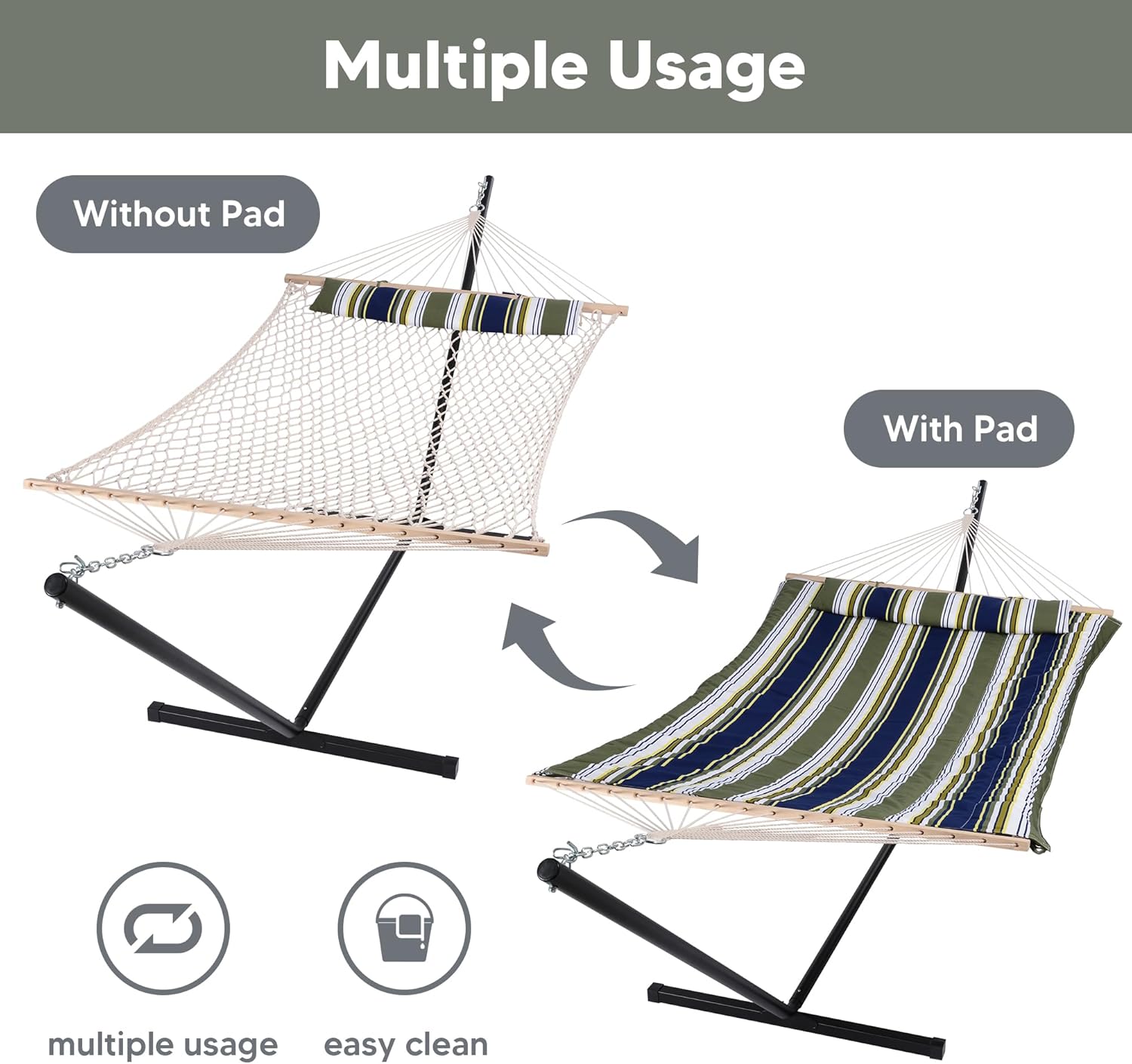 SUNCREAT Hammocks Double Outdoor Hammock with Stand, Cotton Rope Two Person Hammock with Polyester Pad & Large Pillow, Blue& Gray