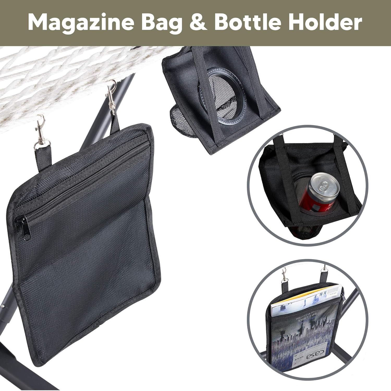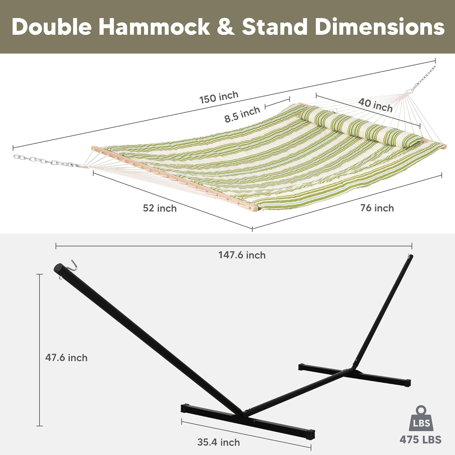 SUNCREAT Cotton Rope Hammock for Two People with Hardwood Spreader Bars, Quilted Fabric Pad & Detachable Pillow, Extra Large Hammock with 12 FT Steel Stand, Ipad Bag & Cup Holder, Green&Beige
