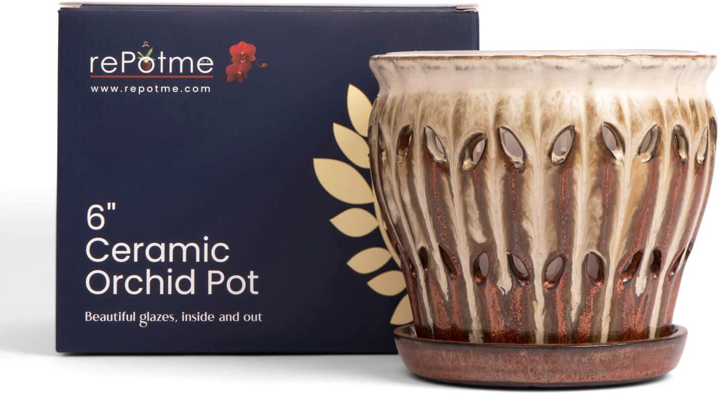 rePotme 6" Pinwheel Fluted Ceramic Plant Pot (Honey Cream Over Copper) - Great for Orchids, Succulents, and All Indoor Plants