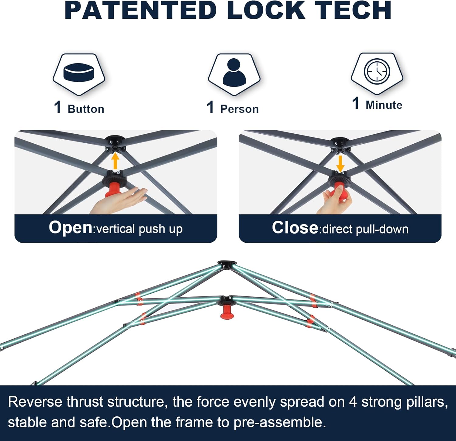 - 【Easy Setup on Seconds】This canopy tent enables 1 person set-up in 1 minute, which uses fully assembled One-Piece frame, no tools needed. Just open the frame, attach the fabric and adjust the legs height. Enjoy the shade quickly and easily under the sun.