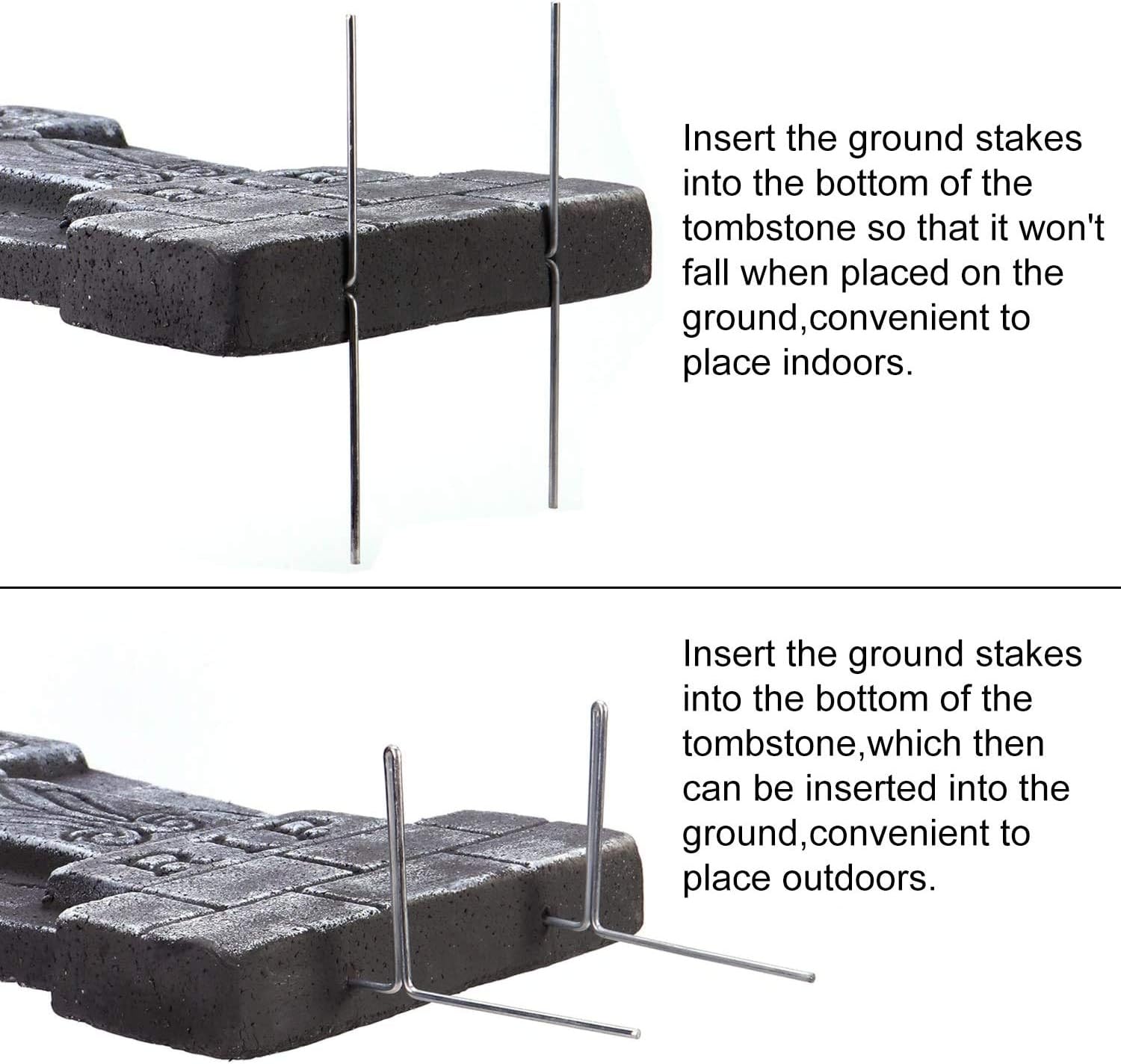 - Package included, pack of 5 different foam RIP graveyard tombstones. It comes complete with 2 metal stakes for securing them into the ground