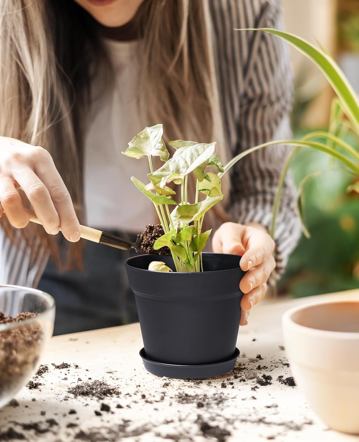 - 【Size of Planter Pots】Each plastic pot is 6 Inch in Opening Diameter, 4 Inch in Bottom Diameter, 5 Inch in Height. With a tray, these black planters are the best choice for growing indoor and outdoor small to medium-sized home/office plants.